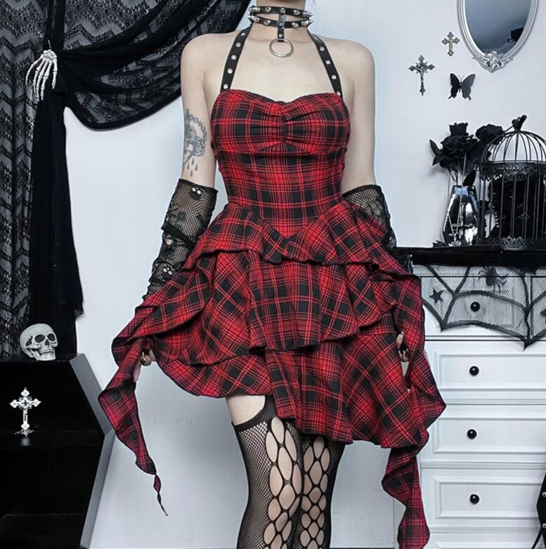 ハロウィン衣装 ジャンパースカート ミニ丈 ショート丈 ホルターネックワンピース チェック柄 暗黒 ゴシック ロリータ ストラップ ワンピース セクシー系 コスプレ衣装 レディース 女子 イベント 学園祭 ハロウィン コスチューム 赤黒 S M L