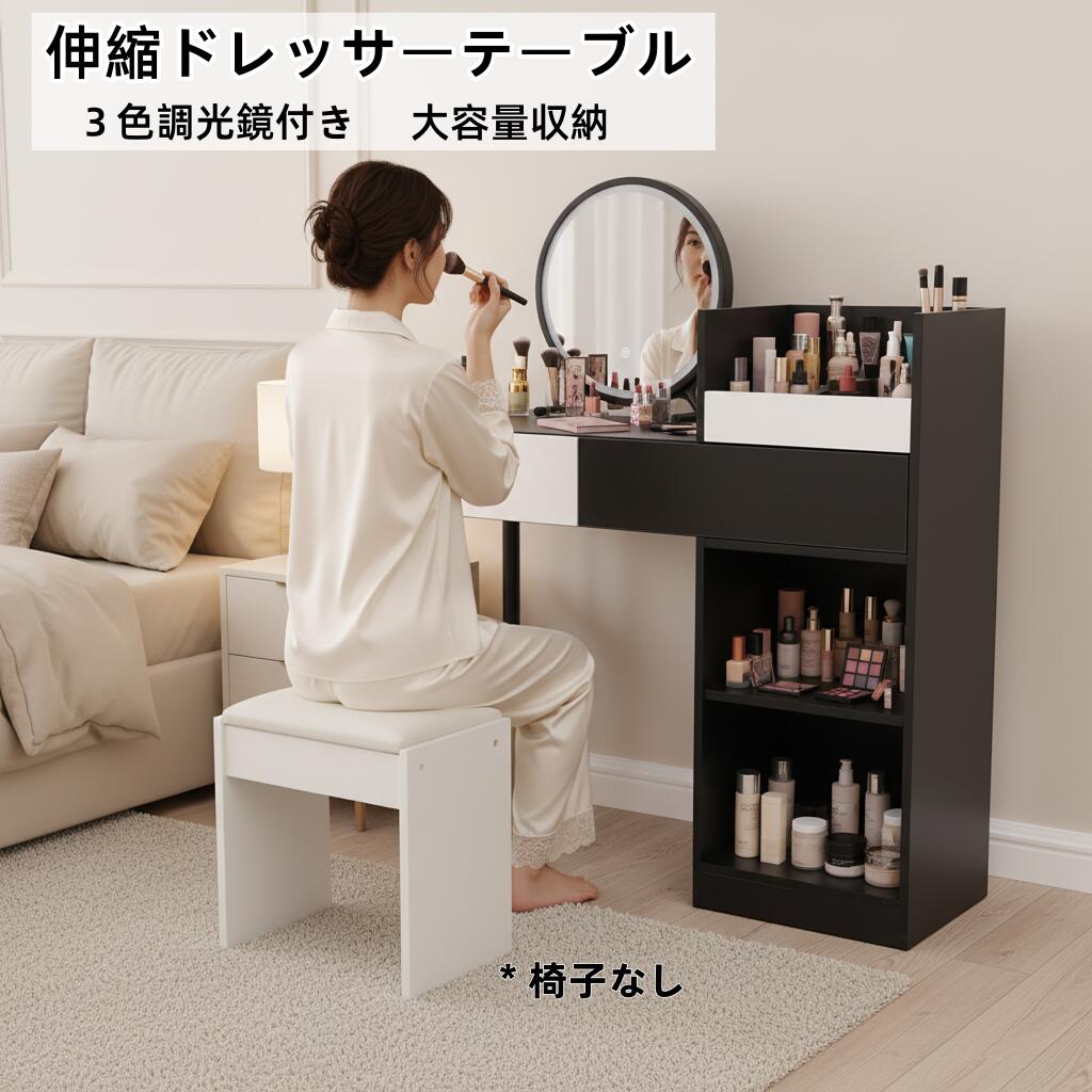 ドレッサーテーブル 伸縮 キャビネット付き 化粧台 引き出し付き LED鏡付き ライト付き 三色調光 138*38*95 コンパクト 北欧 メイク台 コスメ収納 大容量 メイクアップ 女の子 組立品 ブラック ドレッサー 照明 ドレッサー ライト ドレッサー クリップライト 化粧台 鏡台かわいい おしゃれ ドレッサーおしゃれ ドレッサー机 収納 ドレッサー木 かわいい コンパクト 「幅伸縮できるドレッサーテーブル」幅97.5~136cmの範囲でコンパクトにもワイドにも使える伸縮式ドレッサーテーブルです。置き場所によって横幅を変えられますが省スペースだからワンルームのお部屋にもおすすめ。「三色調光のLED鏡付き化粧台」鏡のライトは3つの照明モードから選択できますがライトの電源はタッチ式を採用して軽く触れるだけ、三色調光可能でお好みの明るさに調整してメイクできます。「ドレッサーとテーブル兼用」机の天板は広めて、メイク用品を置いてもゆったり使えて、邪魔にならずレイアウトしやすいです。鏡の部分は自由に設置できますが下の机がパソコンを載せてちょっと作業してもぴったりします。「大容量収納できるメイク台」こちらのメイク台には2杯違うサイズの引き出しつき、メイク道具や小物などたっぷり収納できます。右に4段収納ラック付き、一番上に2部分を分けてよく使うコスメなどを置け、下の3段高さが違うラックにカバン、収納ボックス、高いボルトなど収納できます。「高級感材質&組立簡単」ドレッサーに耐久性ある繊維板素材採用してメラミン採用して表面は滑らかで光沢があり、清潔も簡単です。モダンなデザインでどんな部屋にも馴染んでいます。組み立てもやすくて説明書通りに簡単に組み立て完成です。 5