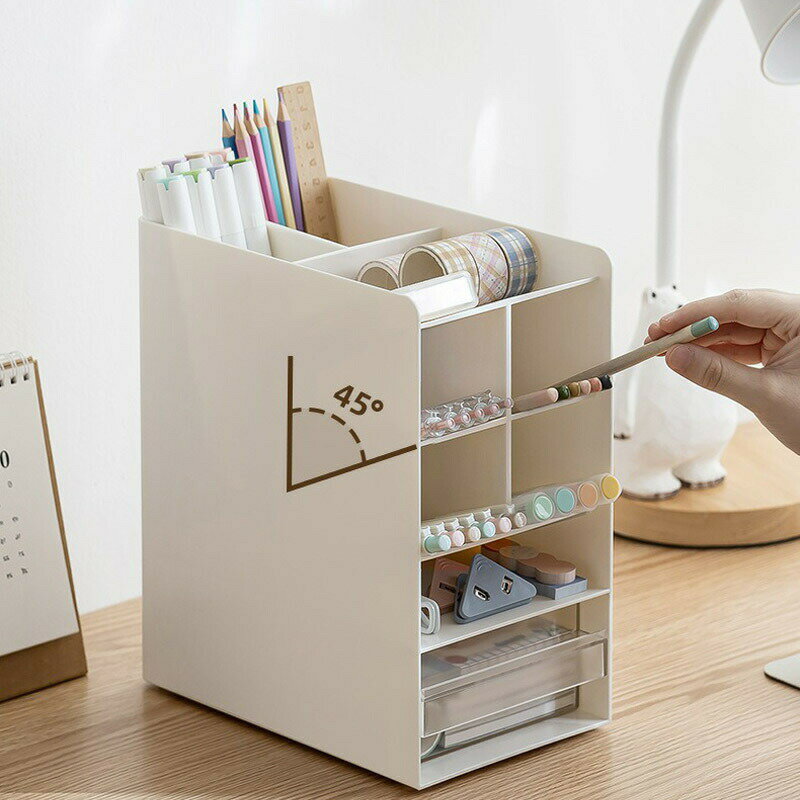 デスクオーガナイザー 卓上収納ボックス ペン立て 化粧ブラシ収納 文房具 大容量 引き出し付き 一体設計 分類収納 小物収納 オフィス収納 透明引き出し 卓上収納 取付不要 整理整頓 小物ケース 化粧品 多機能 整理 様々なアイテムを収納でき、デスクトップが清潔になります。 "【斜面設計・取り外し可能】取り外し可能な傾斜内枠。45度の特殊な傾斜設計で、ペンの重心支持を利用して、ペンを収納する空間を大きくしました。長さや太さの異なるサインペン、鉛筆、マーカーペン、はさみ、定規などの事務用品や学習用品を簡単に収納することができます。取り出すのも入れるのもとても便利です。【多機能・分類収納】このデスクオーガナイザーは、一体型の多機能デスクデスクオーガナイザーです。上にはテープ、ブックマーク、リモコンなどの小物を置く物置トレイがあり、真ん中には各種のペンや文房具を置くことができ、一番下には引き出しがあり、巻き尺、消しゴム、便利貼りなどの事務用品を収納することができる。事務の効率を高めた。【多場合適用?持ち運び】寝室、部屋、教室、書斎、オフィスでご利用いただけます。机や机、オフィスのデスクなどに置いて使うことができます。【広い用途】ダイスクオーガナイザーは容量が大きく、様々なアイテムを収納でき、デスクトップが清潔になります。ボールペン、ふせん、はさみ、、カードなどの事務用品をすっきりと収納できます。引き出しにはピンやクリップ、USBメモリーなどの小物も収納できます。" 5