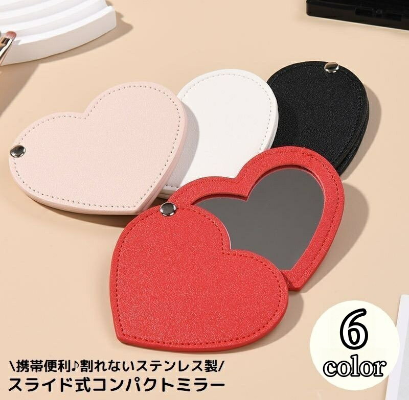 ハート型のかわいいデザイン♪ 360度スライド式のコンパクトミラーです。 持ち運び便利な小さめサイズ☆ ステンレスミラーなので割れる心配もありません◎ 【サイズについて】 画像をご参照ください。 【カラーについて】 生産ロットにより柄の出方や色の濃淡が異なる場合がございます。 お使いのモニターや撮影時の光の加減などにより 画像と実際の商品のカラーが異なる場合もございます。 予告なしにカラーやデザインなどの変更がある場合もございます。 【素材について】 ステンレス合金、PUレザー、PS、PVC