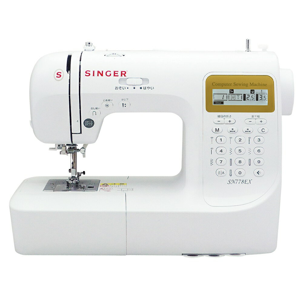 【商品解説】文字まで縫えるコンピュータミシン 充実のステッチ207種類●ひらがな・アルファベットを含む豊富なステッチ207種類 ・実用縫いから、かわいいステッチ、数字、アルファベット、ひらがな、漢字(17文字)まで縫えます。●かんたん下糸セット ・ボビンを入れ矢印に沿って糸をかけるだけ、下糸を引き上げなくてもそのまま縫い始められます。●7枚送り歯 ・厚物や薄物、ひもなどもきれいに縫い上げます。●手元手中操作 ・スタート・ストップ・返し縫いが手元で操作できます。 ・針を上下させるボタンもついて更に使いやすさUP。●全自動ボタンホール ・ボタンを押えにセットすれば、サイズに合ったボタンホールができます。●無段階スピード調節 ・低速から高速まで自由に調節できます。●バックライト付液晶画面 ・選択している模様、使用する押え、縫い目の長さ、ふり幅を見やすく表示、説明書を読む手間が省けます。●ダイレクトボタン ・よく使う模様はパネルに集めダイレクトに選択。●自動針穴糸通し ・面倒な針穴糸通しもレバーひとつでカンタン。【スペック】●型式:SN778EX(SN778EX)●JANコード:4932781051840本体サイズ(高さ×幅×奥行):298×404×188mm本体重量:約5.8kg種類:コンピュータミシンフットコントローラ(ミシン):有自動糸通し:有スタートストップ:有スピード調節:有照明ランプ:有(LEDライト)ボタンホール:有模様選択:207種類本体カバー:有(ハードケース)消費電力:70W付属品:ジグザグ押え(本体に装着)・ファスナー押え・ボタンホール押え・ボタンつけ押え・縁かがり押え・ブラインドステッチ押え・サテン押え・ボビン・ドライバー・ドライバー(小)・ブラシ付きリッパー・針パック・シームガイド・糸コマ押え(大)・糸コマ押え(小)・補助糸立て棒・糸コマ座・ハードケース・説明書・説明DVD・電源コード・フットコントローラー・ワイドテーブルこの商品は宅配便でお届けする商品です出荷可能日から最短日時でお届けします。※出荷完了次第メールをお送りします。配送サービス提供エリアを調べることができます「エリア検索」をクリックして、表示された画面にお届け先の郵便番号7桁を入力してください。ご購入可能エリア検索お買い上げ合計3,980円以上で送料無料となります。※3,980円未満の場合は、一律550円(税込)となります。●出荷可能日から最短日時でお届けします。(日時指定は出来ません。) ※お届け時に不在だった場合は、「ご不在連絡票」が投函されます。 「ご不在連絡票」に記載された宅配業者の連絡先へ、再配達のご依頼をお願いいたします。●お届けは玄関先までとなります。●宅配便でお届けする商品をご購入の場合、不用品リサイクル回収はお受けしておりません。●全て揃い次第の出荷となりますので、2種類以上、または2個以上でのご注文の場合、出荷が遅れる場合があります。詳細はこちら■商品のお届けについて商品の到着日については、出荷完了メール内のリンク(宅配業者お荷物お問い合わせサービス)にてご確認ください。詳しいお届け目安を確認する1度の注文で複数の配送先にお届けすることは出来ません。※注文時に「複数の送付先に送る」で2箇所以上への配送先を設定した場合、すべてキャンセルとさせていただきます。