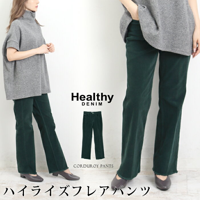 送料無料 Healthy DENIM ストレッチコーデュロイフレアパンツ●ヘルシーデニム レディース 美脚 ズボン ボトムス ロング ブーツカット 無地 シンプル 大人 上品 おしゃれ カジュアル グリーン[52254]【3980円以上送料無料】