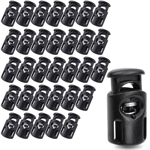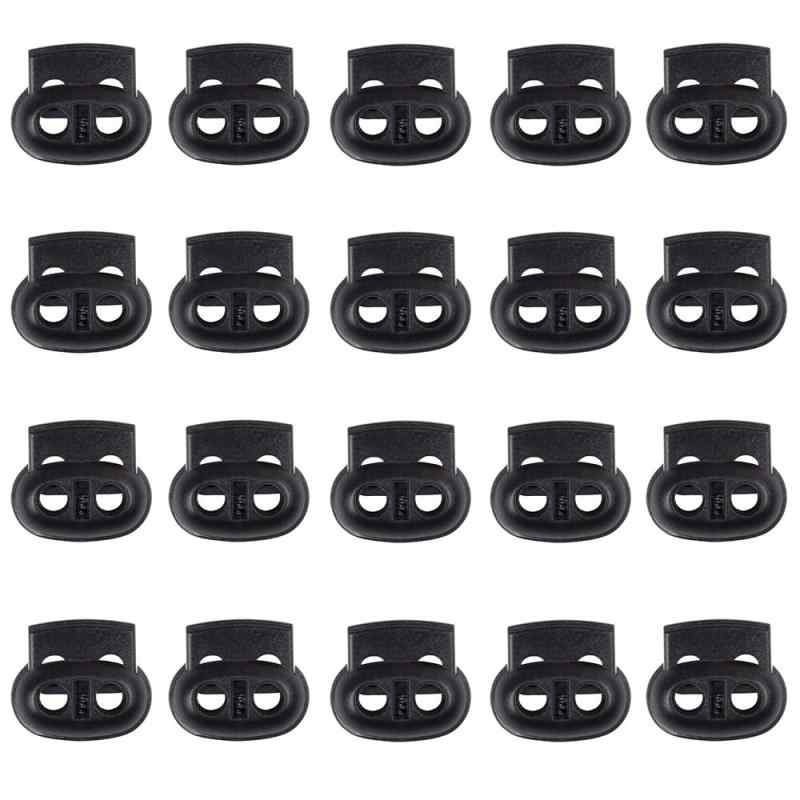 スプリングコードストッパー 2つ穴 2本用コードロック 丸型 穴径約6mm ブラック(20個入り) トグルストッパー スポーツウェア用 プラスチックパーツ 多用途 紐用ゴム スプリング紐止め 交