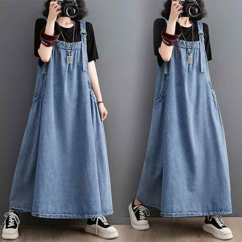 レディース ワンピース デニム サスペンダー ハイウエスト ロング 夏 通勤用 かわいい コットン 伸縮性 吸湿速乾 接触冷感 軽量 普段使い