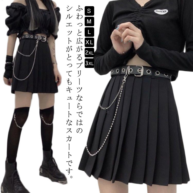 ふわっと広がるプリーツならではのシルエットがとってもキュートなスカートです。量産型&地雷系ファッション好きの方はぜひ。Aラインシルエットでハイウエスト仕様なのでスタイルアップに期待がもてます。またトップスをINしてタイトに着こなすと足長効果も。インナー付きなので、ミニ丈でも安心して使用できます。素材もしっかりとした肌触りの良いものを使用しており、履き心地もバツグンです。普段のオシャレにはもちろん、 ガーリー系、ゆめかわ、姫系、お嬢様、原宿系ファッションがお好きな方、 ロリータ Lolita ファッションのドレス、文化祭、学園祭、撮影など様々な場面でご利用いただけます。 サイズ S M L XL 2XL 3XL サイズについての説明 S:体重40-45kgの方におすすめM:体重45-50kgの方におすすめL:体重50-55kgの方におすすめXL:体重55-60kgの方におすすめ2XL:体重60-65kgの方におすすめ3XL:体重65-70kgの方におすすめ 素材 ポリエステル 色 黒(ベルト+チェーン付き) 備考 ●サイズ詳細等の測り方はスタッフ間で統一、徹底はしておりますが、実寸は商品によって若干の誤差(1cm〜3cm )がある場合がございますので、予めご了承ください。 ●商品の色は、撮影時の光や、お客様のモニターの色具合などにより、実際の商品と異なる場合がございます。あらかじめ、ご了承ください。 ●製品によっては、生地の特性上、洗濯時に縮む場合がございますので洗濯時はご注意下さいませ。 ▼色味の強い製品によっては他の衣類などに色移りする場合もございますので、速やかに(脱水、乾燥等)するようにお願いいたします。 ▼生地によっては摩擦や汗、雨などで濡れた時は、他の製品に移染する恐れがございますので、着用の際はご注意下さい。 ▼生地の特性上、やや匂いが強く感じられるものもございます。数日のご使用や陰干しなどで気になる匂いはほとんど感じられなくなります。