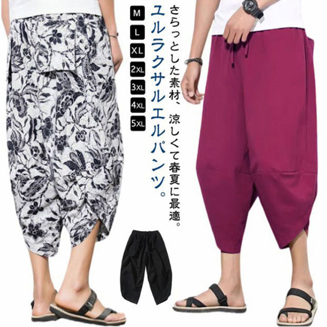 綿麻風 メンズ サルエルパンツ サルエル クロップドパンツ ワイドパンツ 春夏 カジュアルパンツ 7分丈 ビッグサイズ ゆるパンツ プレゼント 夏パンツ ガウチョパンツ 総柄 柄パンツ ウェストゴム 父の日 無地