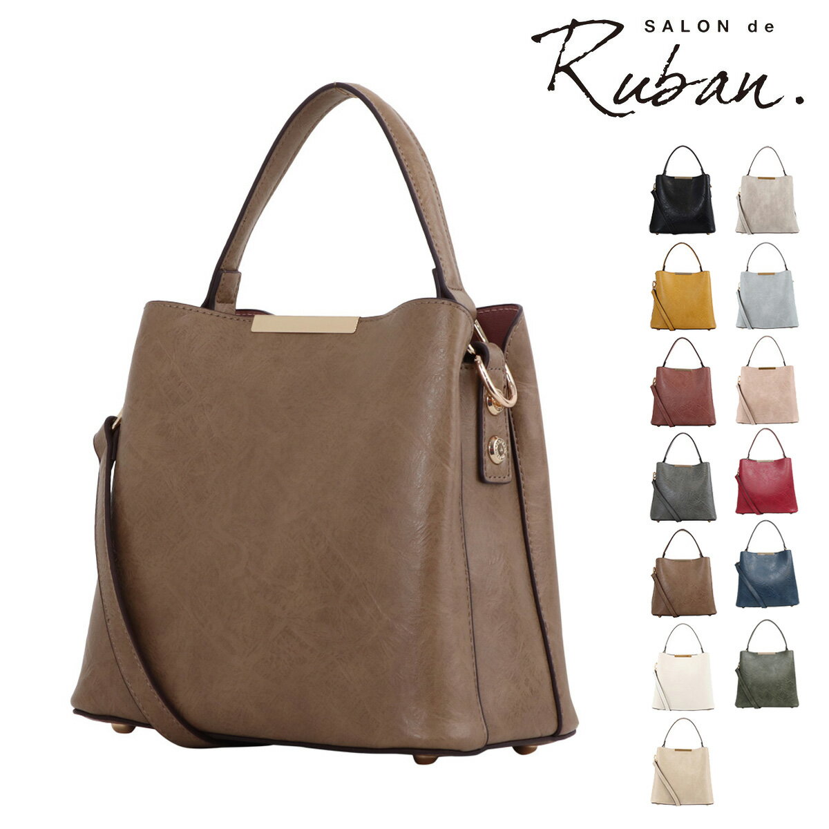 ITEM SPEC COLOR VARIATION ブランド:SALON de RUBAN サロン ド ルヴァン サイズ:約W23×H21×D13cm重量:約500g持ち手長さ:約32cmショルダー長さ:約115~129cm(取り外し可) カラー:オーク×グレーライトグレー×ダークグレーダークピンク×ライトグレーブラック×ブラックアイボリー×グレーピスタチオ×グレーベージュレンガ×グレーベージュイエロー×キャメルライトブルー×ブラウン 素材:合成皮革 仕様:ファスナー式内側:ファスナーポケット×1フリーポケット×1あおりポケット×2 付属:チャーム(ICカード入れ)ショルダーベルト ご注意ください: ● 商品の画像は、できるだけ商品に近いカラーにて掲載をしております。 お客様のモニターの発色または設定により、実際の色味と異なる場合もあります。あらかじめご了承ください。 ● メーカーサイズ、もしくは実際に測った寸法となります。商品の素材等の個体差により、若干サイズのばらつきがあります。サイズはあくまでも目安としてお考えください。 ● 天然皮革・素材を使用している商品によっては、天然素材の特性上、部位により風合いやシミ・シワ感や焦げ、濃淡など多少の個体差がある場合があります。あらかじめご了承ください。