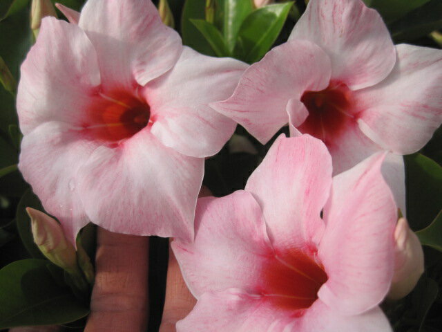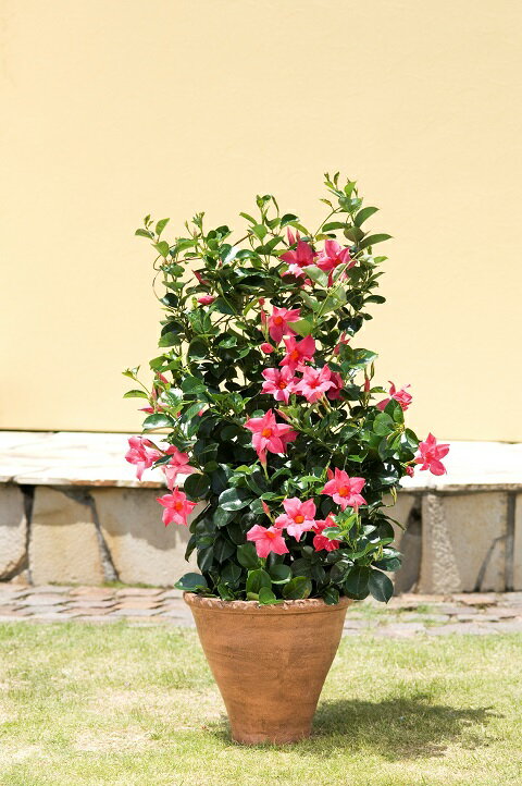 夏空を彩る 夏の間ず〜っと咲き続けて秋までお楽しみいただけます!! 上手に冬越しさせると来年は大株となり素晴らしい咲き姿になり感動すること間違いなし!! 大株に育てて豪華な花な花を咲かせてみませんか!?丈夫で育てやすい花ですから・・・ 真夏の暑い時も咲き続けるトロピカルフラワーです。 この花が咲き出すと夏の朝、外に出るのが楽しみになるはずです。 初夏の早い時期から咲くのでまとまり良い咲き姿をお楽しみいただけます。 つるがあまり伸びない おとなしいタイプです。 色あざやかな花が情熱的な印象です。 日常の手入れ: 寒さに弱いので移動できる鉢植えで育てるのが基本です。つるが伸びるので支柱やフェンスなどにつるをからませます。新しく伸びたつるに花芽をつけますので新芽はカットせずに巻きつけましょう。 花後は冬室内に取り込む前に翌年の花付きをよくするため、つるを3〜4節の越してすべて短く刈り込みます。 日当たり・置き場所 日当たりのよい場所を好みます。生育期間中の春から秋にかけては屋外の日当たりのよい場所で育てます。 寒さには弱く10℃を切ると生育が衰えたり枯れることもあります。11月頃には室内に取り込んで窓辺の日当たりのよい場所で育てましょう。冬でも15℃以上の気温があり、日当たりもよければ花が咲くことがあります。 水やり・肥料 春から秋にかけては土の表面が乾いたらたっぷりと水を与えましょう。秋から徐々に水やりの回数を減らして冬はやや乾燥気味にします。 肥料は春に新芽が伸びてきたら液体肥料を水やり代わりに月2〜3回与えます。肥料は秋まで与えます 。固形肥料を用いる場合は2ヶ月に1回を目安にします。 用土 水はけの良い土が適しています。赤玉土(小粒)6:腐葉土4の割合で混ぜた土など。 植え替え・植え付け 根が非常によく張るので小さな鉢に植えているものは1年に1回植え替えが必要です。植え替えの適期は4〜5月で、新芽が伸びてきて気温が充分に確保(10〜15℃程度)できるようになってから行います。古い土を軽く落としてから一回り大きな鉢に新しい用土で植え替えます。購入した苗を植え付ける場合、芽の先端を摘んでワキから芽を出させます。 夏中咲き続けるパワフルなトロピカルプランツ!! 丈夫で育てやすいマンデビラです。
