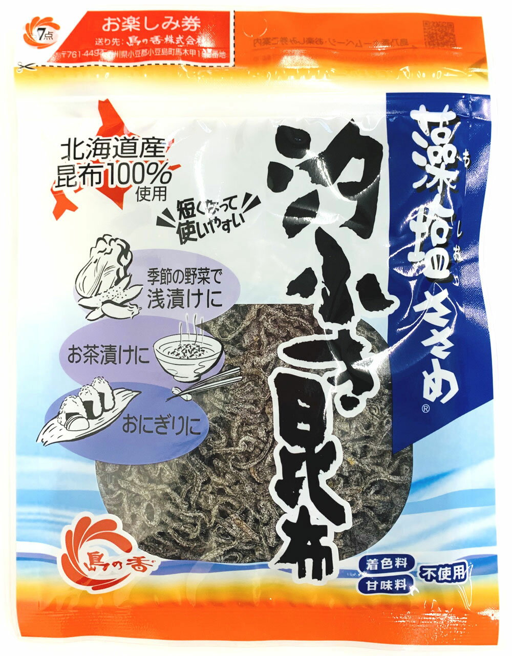 名称:佃煮 【熱中症対策にもおすすめ 汐ふき昆布】ささめ22g 商品説明文: 細切りの汐ふき昆布。ミネラル豊富な昆布と適度な塩分で熱中症予防にもおすすめです。 北海道産昆布の風味が生きた伝統の細切り汐ふき昆布です。 内容量: 22g /袋 原材料名: 昆布(北海道産)、還元水あめ、醤油、食塩、砂糖/調味料(アミノ酸等)、酸味料、増粘多糖類、(一部に小麦・大豆を含む) 栄養成分(100gあたり): 熱量 245 kcal たんぱく質 14.1 g 脂質 0.5 g 炭水化物 46.0 g 食塩相当量 16.5 g 賞味期限: 賞味期間 12ヶ月 製品製造国: 日本 保存方法: 直射日光を避け、常温で保存してください。 配送方法: 宅配便 製造(販売)者 島乃香株式会社 所在地:香川県小豆郡小豆島町馬木甲182