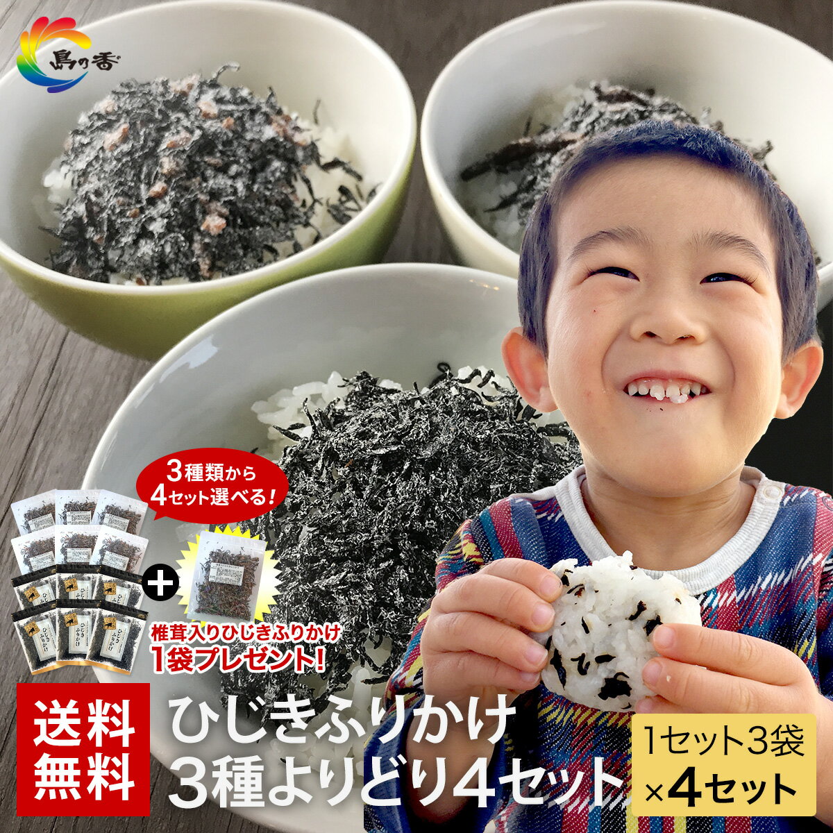 【楽天ショップ・オブ・ザ・マンス受賞】 ひじきふりかけよりどり3種×4セット+椎茸入りひじきふりかけ1袋プレゼント付 送料無料 朝食 おにぎり つくだ煮 佃煮 ひじき 小豆島 老舗 ソフトふりかけ ご飯のお供