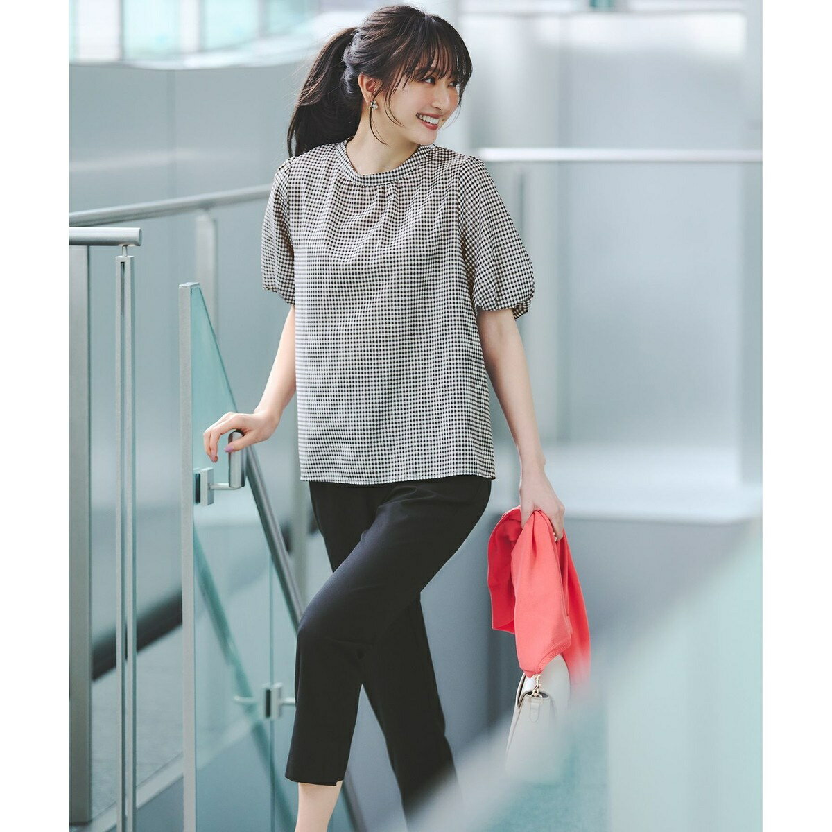 [型番:BLWPCM0580]ふんわり柔らかな印象に仕上がる、袖コンシャスブラウス■デザインバルーンスリーブがポイントの袖コンシャスなフェミニンブラウスです。襟元はシンプルなスタンドネックですっきりと着こなせます。襟元後ろ部分のゴールドのボタンがさり気ないアクセントに。ジャケットやカーディガンを羽織っても、1枚でも素敵に決まる着映えする一着です。■素材ストライプ状の織りが入った透け感と光沢感のある素材を使用。柔らかでふんわりとした生地感になっています。ポリエステル100%の為、シワなりにくいのも嬉しいポイント。生地の表情を生かした無地とギンガムチェックの展開です。こちらの商品はサイズバリエーションがございます。Rレギュラーサイズ(BLWPCM0580) S小さいサイズ(BLWQCM0580) L大きいサイズ(BLWKCM0580)※商品画像はサンプルを使用しているため、色味やサイズ等の仕様に変更がある場合がございますので、予めご了承ください。※屋外での撮影画像は、光の加減で色味が違って見える場合がございます。商品の色味はスタジオ撮影の画像をご参照ください。#anySiS #エニシス #エニィシス #エニスィス#レディース #ブラウス #バルーンスリーブ #ギンガムチェック #シアー #きれいめ #上品 #きれいめコーデ #きれいめスタイル #レディスタイル #休日コーデ #洗える #ウォッシャブル #カジュアル #カジュアルスタイル #カジュアルコーデ #通勤 #お仕事コーデ #オフィスカジュアル #オフィススタイル■カラー:ギンガム、オフ、ライトブルー、ミント2:前身頃60.5 後身頃58.0 身幅52.0 肩幅33.5 そで丈30.0※( )で表記されている数字はヌードサイズです。ヌードサイズとは衣服を身につけない身体のサイズです。お客様ご自身の身体サイズと比較してお選びください。 ■素材: [本体]ポリエステル:100%[別布]ポリエステル:100% ■お手入: 洗濯機、酸素系漂白剤可、タンブル乾燥不可、自然乾燥、アイロン仕上げ可、ドライ、ウエットクリーニング可 >>商品のお取り扱い方法 ■原産国: 中国【洗える】シアーストライプ ブラウス/エニィスィス(ANY SIS)ギンガムオフライトブルーミント画面上と実物では、多少色具合が異なって見える場合がございます。