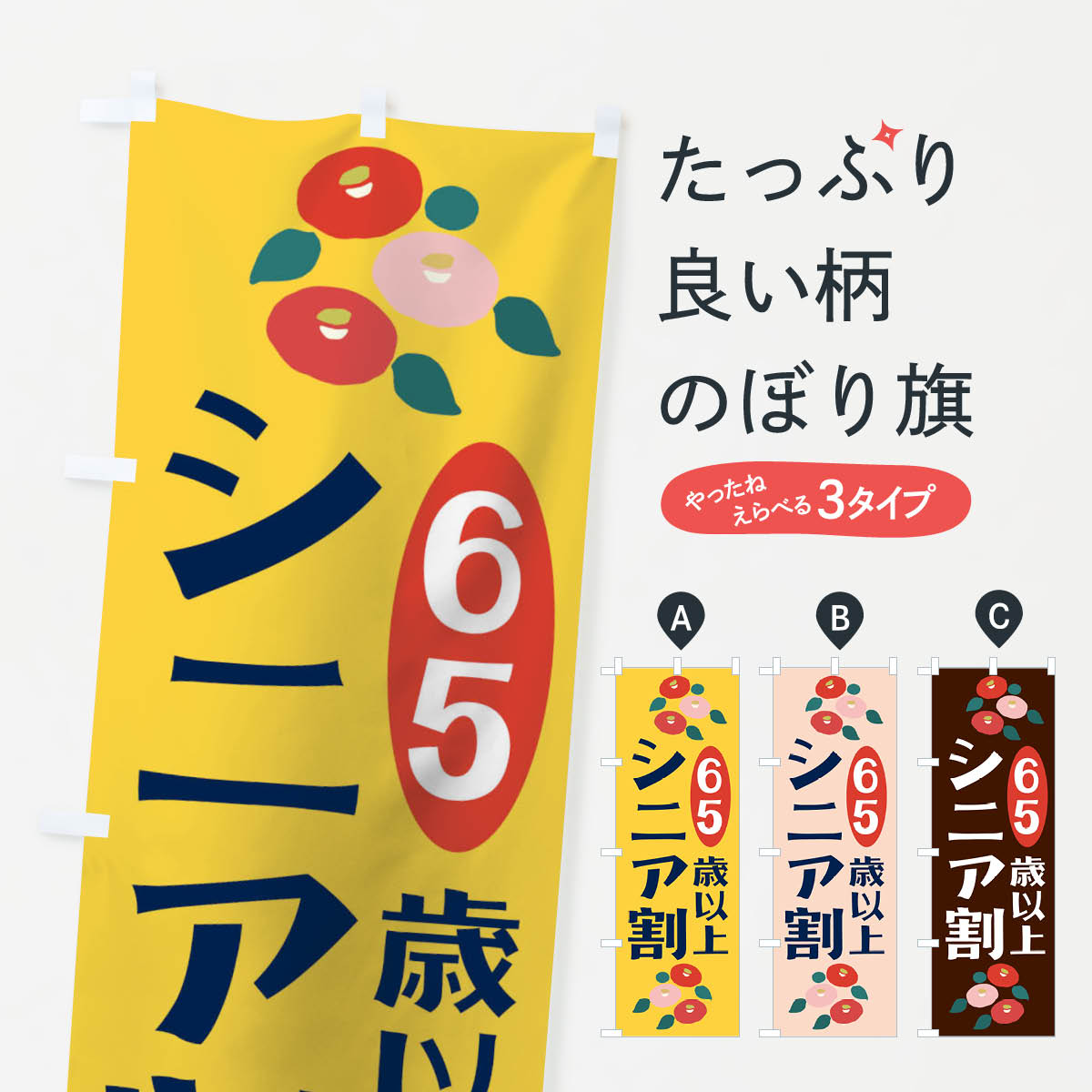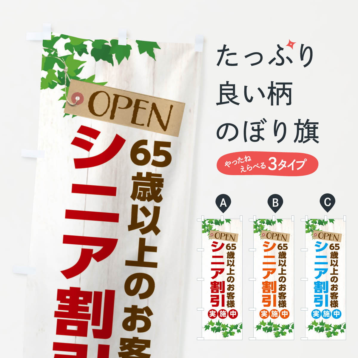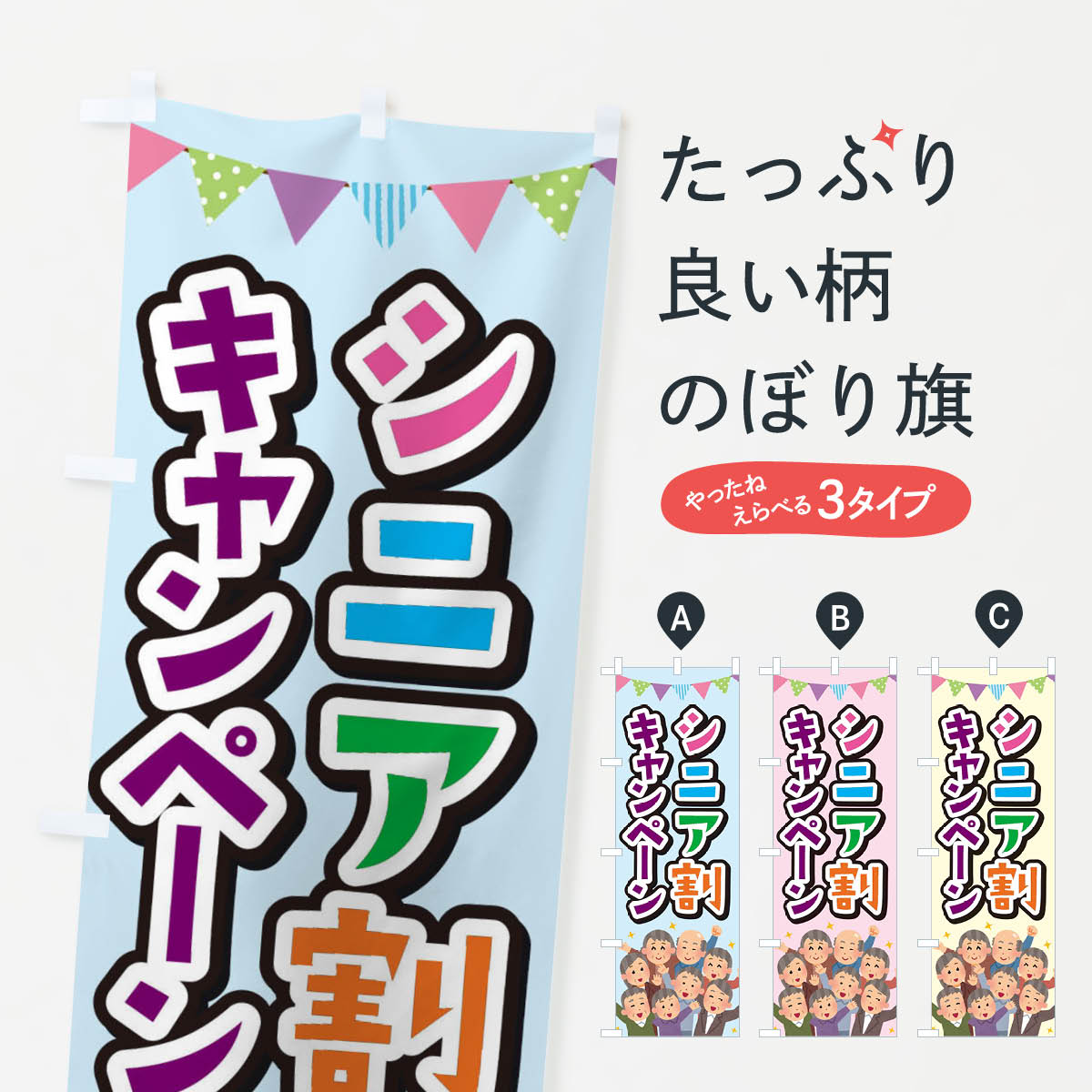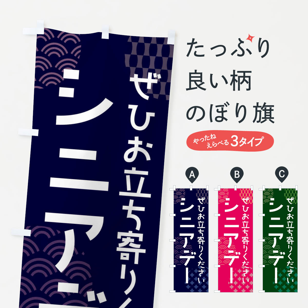 グッズプロののぼり旗は「節約じょうずのぼり」から「セレブのぼり」まで細かく調整できちゃいます。のぼり旗にひと味加えて特別仕様に一部を変えたい店名、社名を入れたいもっと大きくしたい丈夫にしたい長持ちさせたい防炎加工両面別柄にしたい飾り方も選べます壁に吊るしたい全面柄で目立ちたい紐で吊りたいピンと張りたいチチ色を変えたいちょっとおしゃれに看板のようにしたいシニア特典のぼり旗、他にもあります。【ネコポス送料360】 のぼり旗 シニアデー・60歳以上のぼり F6GX シニア特典内容・記載の文字シニアデー・60歳以上印刷自社生産 フルカラーダイレクト印刷またはシルク印刷デザイン【A】【B】【C】からお選びください。※モニターの発色によって実際のものと色が異なる場合があります。名入れ、デザイン変更(セミオーダー)などのデザイン変更が気楽にできます。以下から別途お求めください。サイズサイズの詳細については上の説明画像を御覧ください。ジャンボにしたいのぼり重量約80g素材のぼり生地:ポンジ(テトロンポンジ)一般的なのぼり旗の生地通常の薄いのぼり生地より裏抜けが減りますがとてもファンが多い良い生地です。おすすめA1ポスター:光沢紙(コート紙)チチチチとはのぼり旗にポールを通す輪っかのことです。のぼり旗が裏返ってしまうことが多い場合は右チチを試してみてください。季節により風向きが変わる場合もあります。チチの色変え※吊り下げ旗をご希望の場合はチチ無しを選択してください対応のぼりポール一般的なポールで使用できます。ポールサイズ例:最大全長3m、直径2.2cmまたは2.5cm※ポールは別売りです ポール3mのぼり包装1枚ずつ個別包装 PE袋(ポリエチレン)包装時サイズ:約20x25cm横幕に変更横幕の画像確認をご希望の場合は、決済時の備考欄に デザイン確認希望 とお書き下さい。※横幕をご希望でチチの選択がない場合は上のみのチチとなります。ご注意下さい。のぼり補強縫製見た目の美しい四辺ヒートカット仕様。ハトメ加工をご希望の場合はこちらから別途必要枚数分お求め下さい。三辺補強縫製 四辺補強縫製 棒袋縫い加工のぼり防炎加工特殊な加工のため制作にプラス2日ほどいただきます。防炎にしたい・商標権により保護されている単語ののぼり旗は、使用者が該当の商標の使用を認められている場合に限り設置できます。・設置により誤解が生じる可能性のある場合は使用できません。(使用不可な例 : AEDがないのにAEDのぼりを設置)・裏からもくっきり見せるため、風にはためくために開発された、とても薄い生地で出来ています。・屋外の使用は色あせや裁断面のほつれなどの寿命は3ヶ月〜6ヶ月です。※使用状況により異なり、屋内なら何年も持ったりします。・雨風が強い日に表に出すと寿命が縮まります。・濡れても大丈夫ですが、中途半端に濡れた状態でしまうと濡れた場所と乾いている場所に色ムラが出来る場合があります。・濡れた状態で壁などに長時間触れていると色移りをすることがあります。・通行人の目がなれる頃(3ヶ月程度)で違う色やデザインに替えるなどのローテーションをすると効果的です。・特別な事情がない限り夜間は店内にしまうなどの対応が望ましいです。・洗濯やアイロン可能ですが、扱い方により寿命に影響が出る場合があります。※オススメはしません自己責任でお願いいたします。色落ち、色移りにご注意ください。商品コード : F6GX問い合わせ時にグッズプロ楽天市場店であることと、商品コードをお伝え頂きますとスムーズです。改造・加工など、決済備考欄で商品を指定する場合は上の商品コードをお書きください。ABC【ネコポス送料360】 のぼり旗 シニアデー・60歳以上のぼり F6GX シニア特典 安心ののぼり旗ブランド 「グッズプロ」が制作する、おしゃれですばらしい発色ののぼり旗。デザインを3色展開することで、カラフルに揃えたり、2色を交互にポンポンと並べて楽しさを演出できます。文字を変えたり、名入れをしたりすることで、既製品とは一味違う特別なのぼり旗にできます。 裏面の発色にもこだわった美しいのぼり旗です。のぼり旗にとって裏抜け(裏側に印刷内容が透ける)はとても重要なポイント。通常のぼり旗は表面のみの印刷のため、風で向きが変わったときや、お客様との位置関係によっては裏面になってしまう場合があります。そこで、当店ののぼり旗は表裏の見え方に差が出ないように裏抜けにこだわりました。裏抜けの美しいのグッズプロののぼり旗は裏面になってもデザインが透けて文字や写真がバッチリ見えます。裏抜けが悪いと裏面が白っぽく、色あせて見えてしまいズボラな印象に。また視認性が悪く文字が読み取りにくいなどマイナスイメージに繋がります。いろんなところで使ってほしいから、追加料金は必要ありません。裏抜けの美しいグッズプロののぼり旗でも、風でいつも裏返しでは台無しです。チチの位置を変えて風向きに沿って設置出来ま