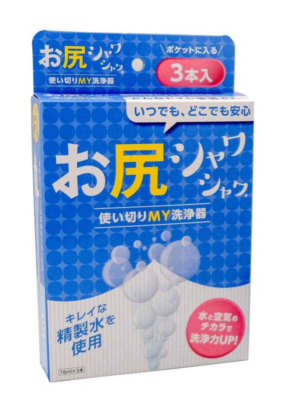 携帯用 ポケット お尻洗浄器 お尻シャワシャワ 特殊なノズル技術で、水と空気をミキシングして水玉状に噴射する、使い切りお尻洗浄器。 キレイな精製水を使用。 個別包装されているので、いつでもどこでも清潔にお使い頂けます。 ポケットに入るコンパクトサイズで持ち運びにも適しています。 いつでもどこでも使用できる。 災害や建設現場等で、トイレが満足に使えない場合でも、お尻シャワシャワがあれば、トイレを済ませた後に使用して、お尻を清潔にすることができます。 海外旅行やアウトドアシーンなど、シャワー式便座のない海外旅行先や山登り、海水浴などのアウトドアの時にも便利です。 シャワー式便座のないアパートや飲食店などでの備えにもおすすめです。 国際線機内持ち込みOK! 国際線機内持ち込みOKなコンパクトサイズです。 (※持込み方法については、航空会社の規定をご確認下さい。) 概要 成分 精製水 入数 16ml×3本(個別包装、印刷袋入り) ご使用上の注意 ・ご使用後は、絶対に容器をトイレに流さないでください。詰まりの原因となります。 ・肌に異常(傷口など)がある場合は注意する。または使用を控えるようにしてください。 ・ご使用は1本につき1回使い切りです。 ・ご使用中に異常が発生した場合はご使用を中止し、医師にご相談ください。 ・この製品は容器をフィルムで包んでいます。包装がない場合、破れている場合、開封された形跡がある場合は使用しないでください。 使用期限 商品お受け取りから5年を目安に交換をお願いします。 保管上の注意 ・直射日光や高温多湿の場所を避け、包装フィルムに入れたまま涼しい場所で保管してください。 ・乳幼児の手が届かない場所に保管してください。 1箱サイズ / 重量 約 160 × 100 × 25 mm / 約 80 g 1ケース購入した場合の入数 48個入り