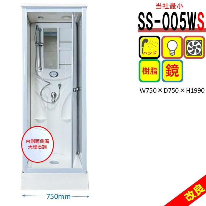 【台数限定価格・樹脂へ改良】シャワーユニット SS-005WS(小)W750×D750×H1990 最小サイズ あきらめていた場所にも置けるシャワールーム LEDライト 換気扇 鏡 付き 両側面 内側 大理石 調 柄 側面 目隠し 樹脂 パネル 軽くて 小さい シャワーボックス 後付け可能