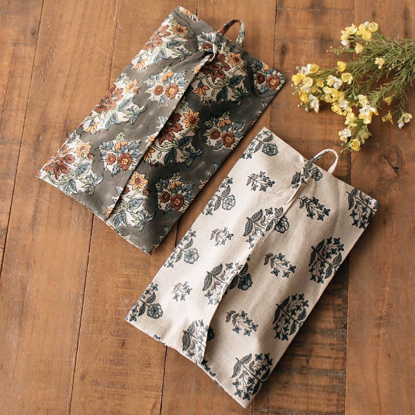 ティッシュケース おしゃれ 壁掛け ティッシュカバー 吊り下げ 布 リネン風 南仏ブルー シャンブレー生地 車 洗面所 吊るす かわいい 可愛い インド職人 手仕事 ナチュラル ボタニカル柄 ブロックプリントのティッシュカバー 2タイプ
