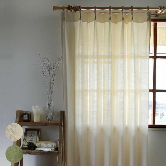 カーテン シャンブレークロス 薄手のナチュラル感のある地織りカーテン ナチュラルな無地。ざっくりとした生地感が麻の様で素敵です。 落着きのあるグリーンの色合いが安らぎの空間づくりにぴったり。 シャンブレークロスは非遮光ですので、窓の光を感じるカーテンです。上の写真は後付け裏地ライナーを付けていますので光を遮っています。カーテンレールに近い上部の生地感がこの生地の特徴になります。 →後付け裏地カーテンはこちら --商品説明------Spec---- 【 商品名 】 【カーテン】シャンブレークロス【オーダーサイズ】 【 カラー 】 アイボリーグリーン 【 素材 】 ポリエステル 100% 【 お選びいただける仕様 】 ◆1.5倍ヒダ プレミアム縫製 1cmきざみ ◆1.5倍ヒダ プレミアム縫製+形状記憶加工 1cmきざみ +990円 ◆フラット プレミアム縫製 1cmきざみ ◆2倍ヒダ プレミアム縫製 1cmきざみ ◆2倍ヒダ プレミアム縫製+形状記憶加工 1cmきざみ +990円 【 タッセル 】 共生地タッセル別売り|1本660円 【 フック 】 アジャスターフック(A・B選択可能)がついています。 丈を調整する場合はフックを移動させてください。 【 お取り扱い 】 洗濯ネットに入れて洗濯機のドライコースで洗えます。 アイロンは80〜110℃の低温でかけてください。