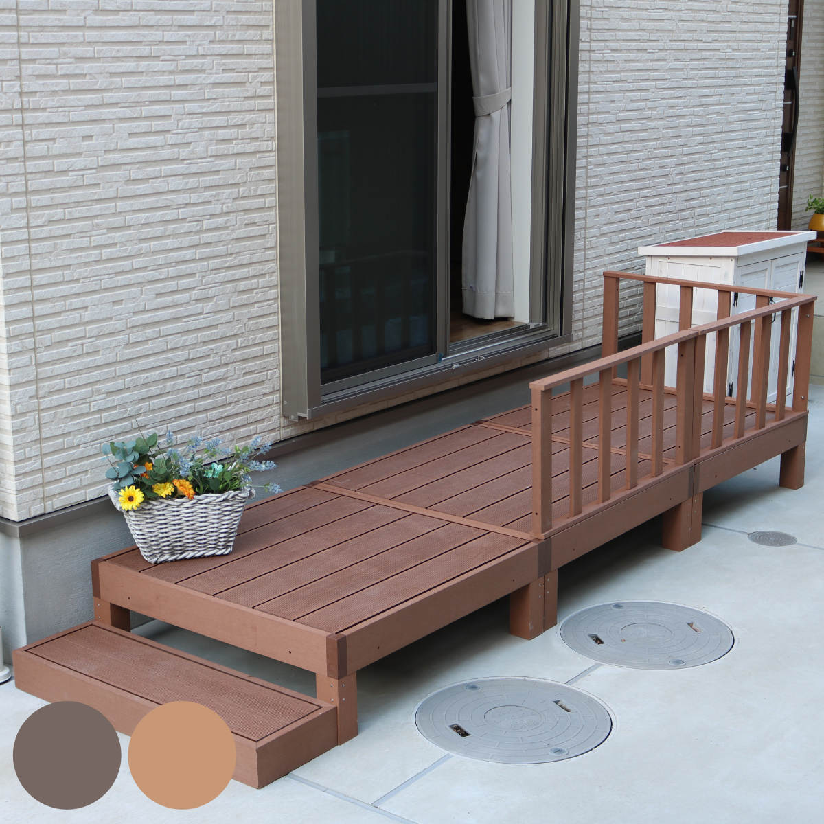 人工木ウッドデッキ ecofeel エコフィール 1台 ステップセット 0.25坪 ( ガーデンデッキ 人工木デッキ 人工木 DIY 縁台 ぬれ縁 90×90cm セット 掃き出し窓 連結 人工木材 バルコニー 庭 エクステリア 外構 簡単 )【39ショップ】