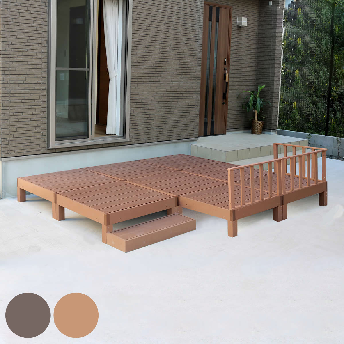 人工木ウッドデッキ ecofeel エコフィール 2台 ステップ・フェンスセット 0.5坪 ( ガーデンデッキ 人工木デッキ 人工木 DIY 縁台 ぬれ縁 90×90cm セット 掃き出し窓 連結 人工木材 バルコニー 庭 エクステリア 外構 簡単 )【39ショップ】