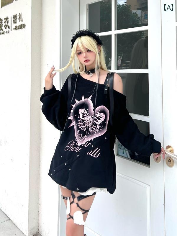 女の子 ファッション ガーリー クール 春秋 オフショルダー レザー バックル ゆったり 長袖 肩出し ハート 病み系女子 かわいい オーバー インスタ映え