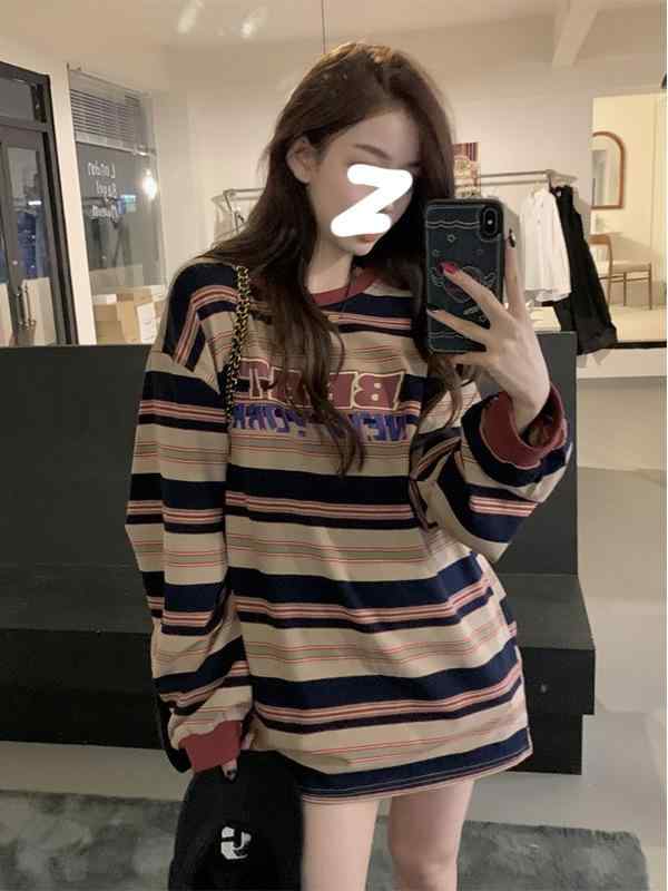 Tシャツ レディース トップス 長袖 ラウンドネック 配色 ストライプ ゆったり ビッグシルエット アメリカン レトロ ロゴ プリント 春秋 インナー 普段使い かわいい・素材: その他・柄: 青春・スタイル: プルオーバー・袖丈: 長袖・フィット: ゆったり・ネックライン: ラウンドネック・袖: 通常袖・カラー: 画像色・サイズ: M, L, XL, XXL・スタイル: 日韓カジュアル、カジュアル・カテゴリー: Tシャツ