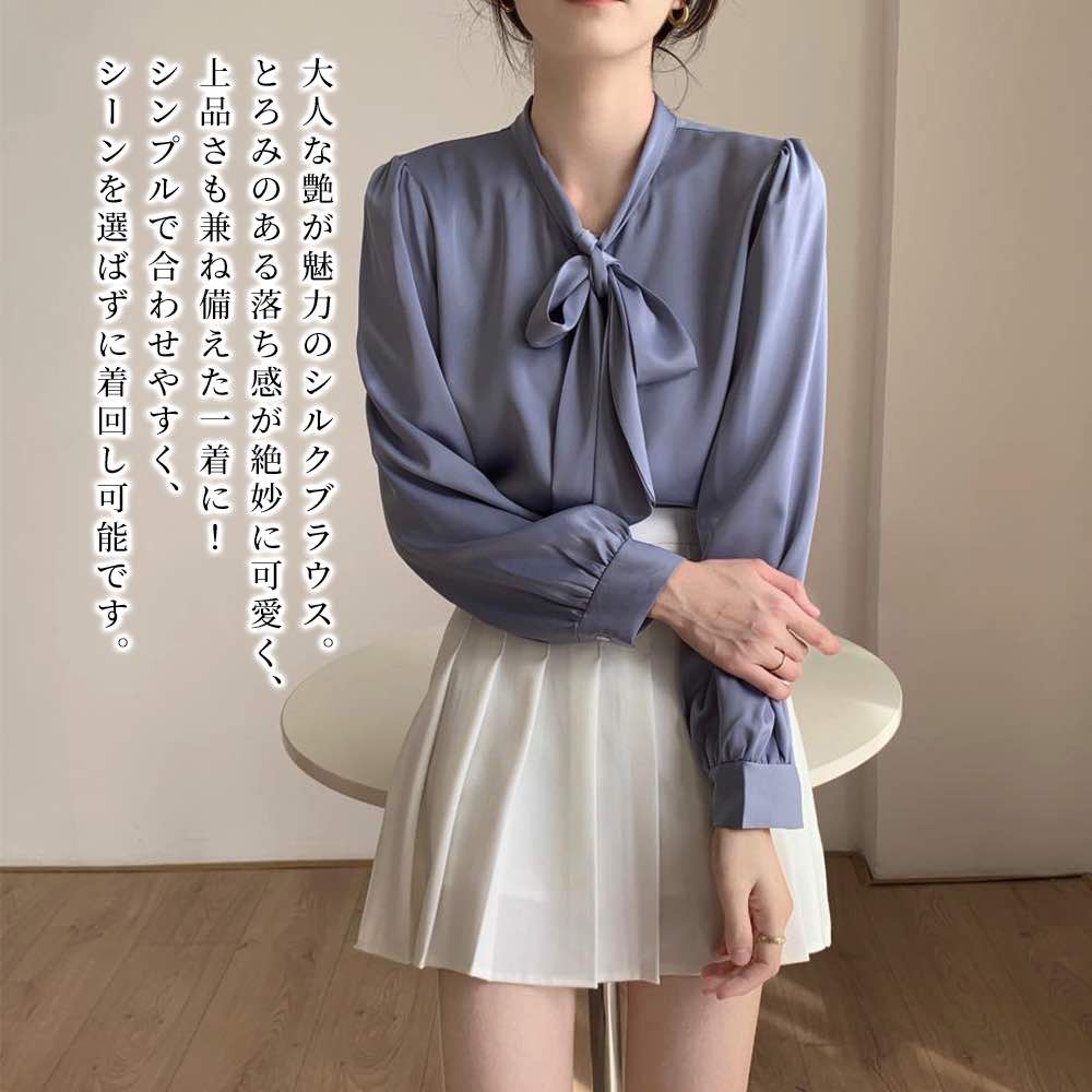レディース シルク リボン ブラウス 春夏 無地 ビジネス トップス 軽量 滑らか 吸湿性 通勤用 普段使い