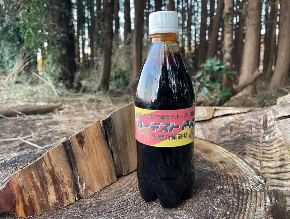 ●電気柵や物理柵が設置出来ない場所でも高い効果を発揮します。 ●間伐材や未利用材を原料とした国家的推進事業を担うプラントで排出される廃液を調整・活用して生まれた忌避液剤です。 ●被害の絶えない全国約100の現場で検証を行い98%のお客様からご満足の声を頂きま した。山火事臭で害獣を撃退! ●対象動物:臭覚に優れた動物 イノシシ、シカ、ハクビシン、キョン、アライグマ、クマ、ネズミ、野良猫 他 ●容器に液剤30〜50mlを入れて、2〜10m間隔で設置します。 ●効果期間は約2〜4ヶ月です。(季節や設置状況により異なります) ●対象獣の鼻の位置近くに設置することで大きな効果を発揮します。 ●強い酸性の成分を持ちますので、植物には液剤が付着しないようにしてください。 設置方法 液剤用の容器を用意 使用済みペットボトル等に画像のように切れ目を入れて加工します。においを拡散しながら雨水を防ぐ構造となっていれば、ペットボトル以外の容器でも問題ありません。 液剤を充填 設置容器に30~50mlを充填します。約1~2cm程度です。作業時は手袋、防護眼鏡等をご使用下さい。また、酸性が強い成分のため、コンクリート等に付着すると色が落とせません。大切な植物に付着すると枯れてしまいますのでご注意ください。 圃場へ設置 地上から設置ボトルの開放部を野生動物の鼻高にあわせて調整して頂きます。例えばイノシシの場合は約50cm、シカで90cmほどの高さに設置してください。 注意事項 雨水が表面を覆ってしまうと臭いが出ません。上澄みを流し出して下さい。 湿度が高くなると液剤表面に水膜が出来ることがあります。その場合は棒などでかき混ぜると匂いが拡散します。 肌に付着た時は素早く、除菌アルコールシート等で拭き取ってください。 ※クレンジングオイルが効果大です。 低温下(約10°C以下)ガーデストProは硬化する事があり臭気も弱まります。 気温上昇、もしくは直射日光などで、温まると再度臭気が発生します。 直火で温めると、硬化してしまい流動性が戻りませんのでご注意下さい。