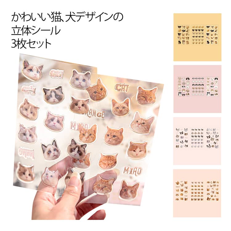 かわいい猫、犬デザインの立体シール。【3枚セット】【立体的なデザイン】ぷっくりとした立体造型が可愛いPVCシール! 指で触れるたびに感じるふくらみと、色あせない鮮やかさが特徴です。お子様の持ち物に貼れば愛着が湧くのはもちろん、大人の上品な小物デコレーションにもぴったり。水に強く剥がれにくいので、長く楽しめる逸品です。【高透明素材】高透明なPVC素材で作られた、水晶のように透き通るシールです。貼るだけでお気に入りのアイテムが一気に宝石箱のように輝きだします。キラキラとした質感と丈夫さを兼ね備え、スマホケースや水筒、日記帳など、毎日使うものも華やかに変身させちゃいましょう【創造性の刺激】あなたの創造力を無限に広げるDIYアイテム!スマホケースやノートパソコンのカスタマイズはもちろん、日記帳・水筒・文具など、あらゆるアイテムを自分だけのアート作品に変えられます。お子様の自由な発想を育む工作材料としても、大人の上質な趣味としても、無限の可能性を秘めたクリエイティブツールです。【ご褒美シール】お子様の頑張りを可愛く褒める、ご褒美シールに最適!子どもたちが良い行いをしたときに、ご褒美としてステッカーを与えると、子どもたちの自信が高まり、良い行いをするための動機付けになります。使用・手入れについて:・表面を清潔にした上で貼り付けてください。・貼り直しはできないため、位置決めは慎重に行ってください。・高温多湿の場所では粘着力が落ちる場合があります。 サイズ タイプ1(3枚セット) タイプ2(3枚セット) タイプ3(3枚セット) タイプ4(3枚セット) サイズについての説明 3枚セット 素材 紙 PVC 色 3種類一つずつ 備考 ●サイズ詳細等の測り方はスタッフ間で統一、徹底はしておりますが、実寸は商品によって若干の誤差(1cm~3cm )がある場合がございますので、予めご了承ください。 ●製造ロットにより、細部形状の違いや、同色でも色味に多少の誤差が生じます。 ●パッケージは改良のため予告なく仕様を変更する場合があります。 ▼商品の色は、撮影時の光や、お客様のモニターの色具合などにより、実際の商品と異なる場合がございます。あらかじめ、ご了承ください。 ▼生地の特性上、やや匂いが強く感じられるものもございます。数日のご使用や陰干しなどで気になる匂いはほとんど感じられなくなります。 ▼同じ商品でも生産時期により形やサイズ、カラーに多少の誤差が生じる場合もございます。 ▼他店舗でも在庫を共有して販売をしている為、受注後欠品となる場合もございます。予め、ご了承お願い申し上げます。 ▼出荷前に全て検品を行っておりますが、万が一商品に不具合があった場合は、お問い合わせフォームまたはメールよりご連絡頂けます様お願い申し上げます。速やかに対応致しますのでご安心ください。
