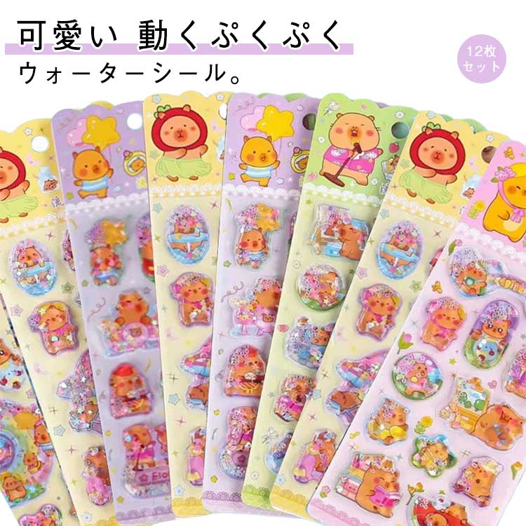 【12枚セット】 ウォーターシール ぷくぷくシール ぷっくりシール デコシール シール帳 3D立体 シャカシャカシール カピバラさん キャラクター 水揺れシール スパンコール入り ご褒美シール 手帳 ノート スマホケース デコ DIY 女の子 男の子 クリスマス プレゼント