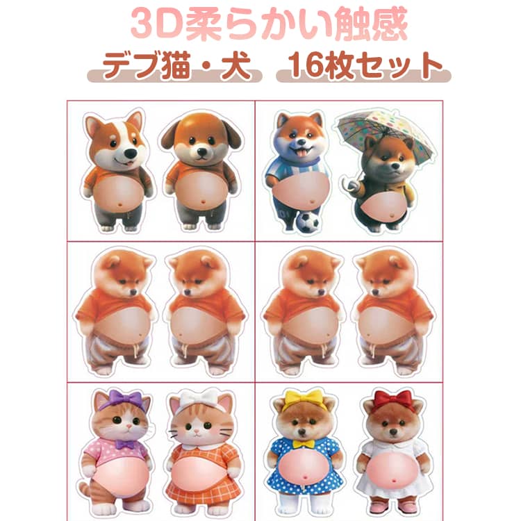 16枚セット 猫 お腹 ぷにぷに シール おしりシール デブ猫 マシュマロシール 柔らかい腹 もっちりスクイーズ ストレス解消 ふわふわ かわいい ぷにぷに触感 癒し スクイーズ ステッカー シール帳 デコレーション 携帯電話飾り用 手帳用 もちもち 柴犬