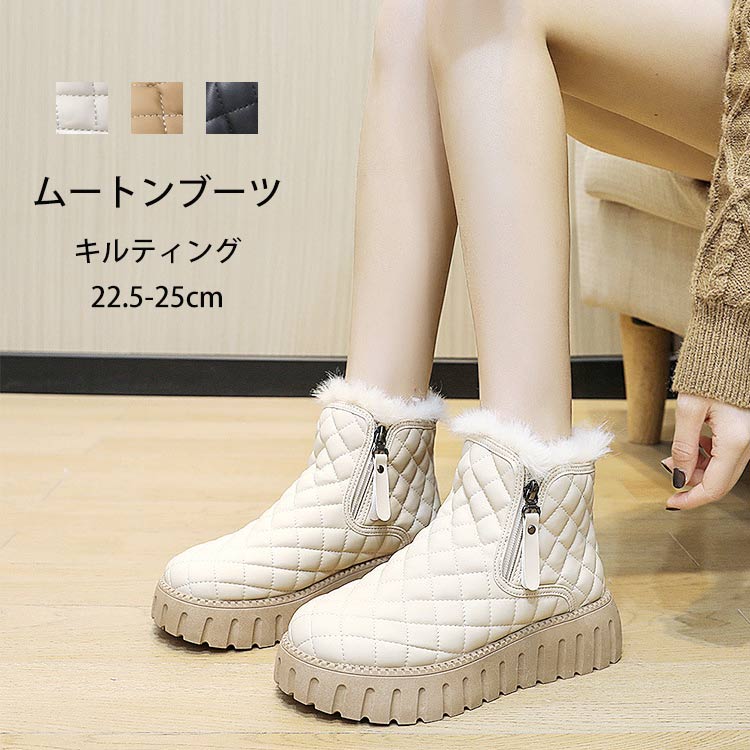 ショートブーツ レディース 厚底 裏ボア ムートンブーツ ショート丈 ジップアップ キルティング ボアシューズ 靴 ファー付き 厚底シューズ 厚底ブーツ 5cmヒール 歩きやすい 履きやすい ブラック オフホワイト ベージュ 22.5/23/23.5/24/24.5/25cm