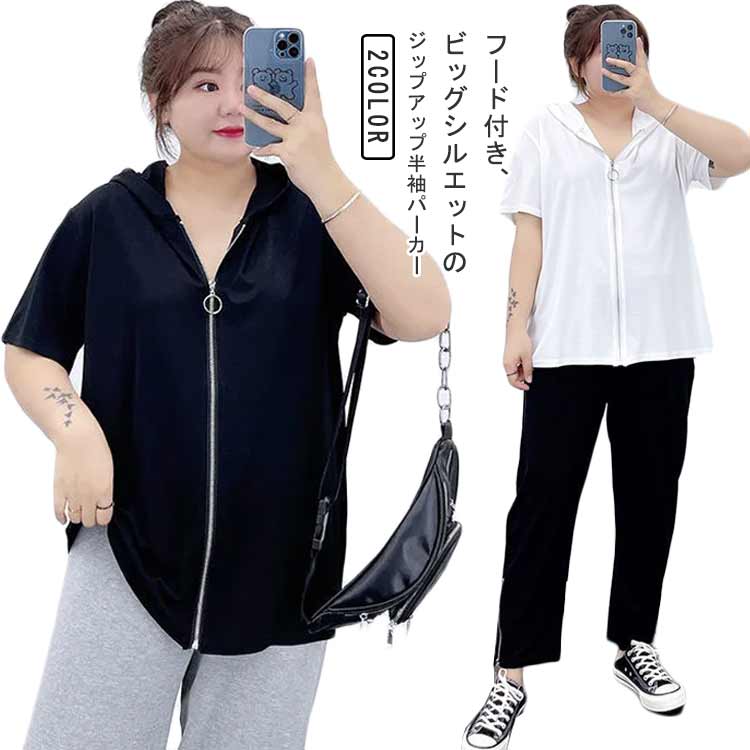 半袖パーカー レディース 半袖 Tシャツ フード付き トップス ジップアップ 前開き パーカー 五分袖 サマーパーカー 羽織り ビッグシルエット 大きいサイズ カジュアル おしゃれ 体型カバー 夏服 送料無料 M-4XL ブラック ホワイト 黒 白