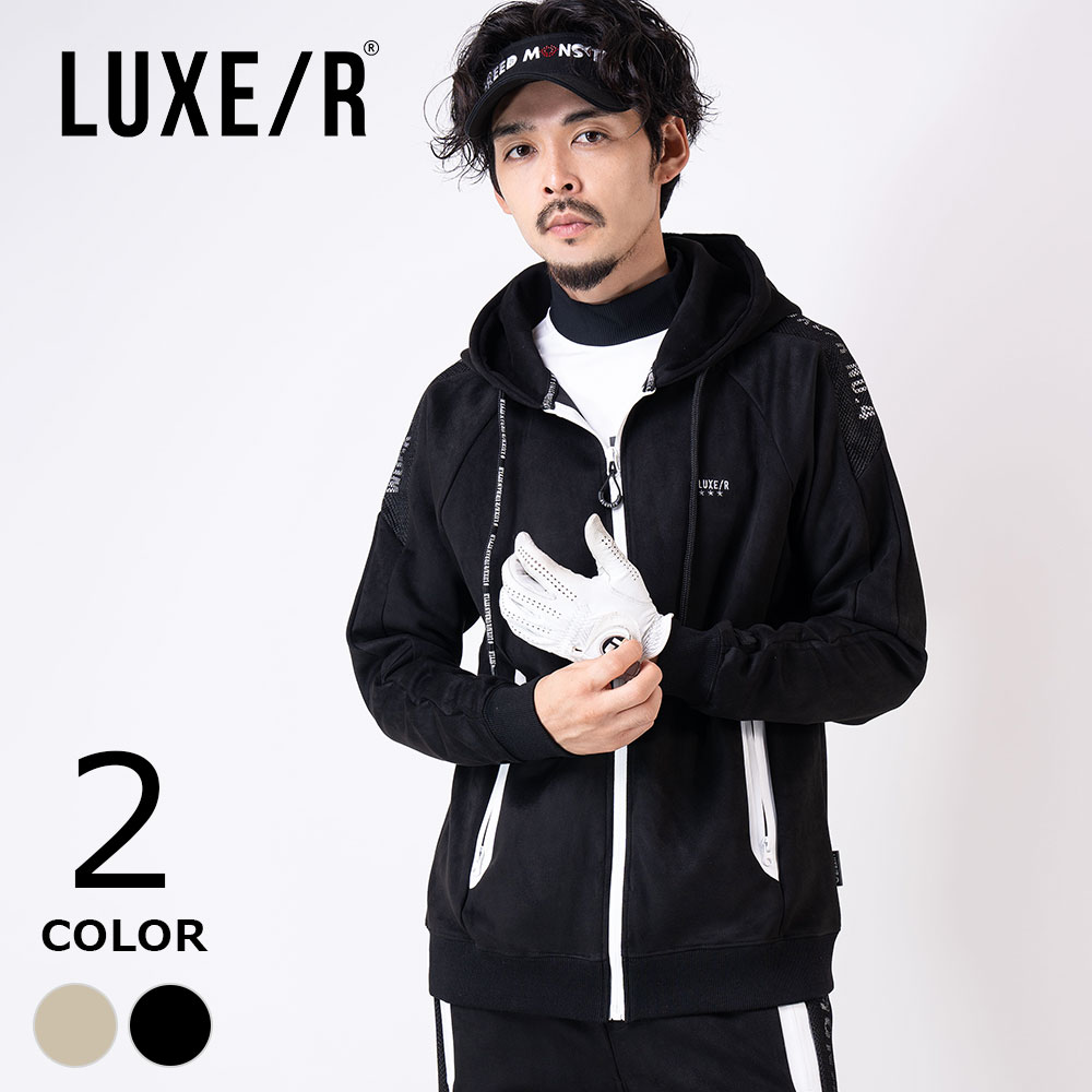 メンズ ゴルフウェア LUXE/R GOLF ポリスウェード 切替 メッシュ ZIPUPパーカー ジャケット ブルゾン パーカー フード ジップパーカー セットアップ ストレッチ 伸縮性 速乾 防風 防寒 機能性 20代 30代 40代 50代 春 秋 冬 上着 羽織り シンプル ブランド ロゴ プリント