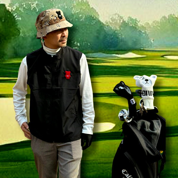ゴルフウェア ベスト メンズ ジップアップ ジップベスト テディベア クマ もこもこ ぷくぷく ふわふわ ワッペン刺繍 3D刺繍 メンズ ナイロン 40代 30代 ストリート クマ ワッペン 大きいサイズ 【DIVAオリジナル ブランド】