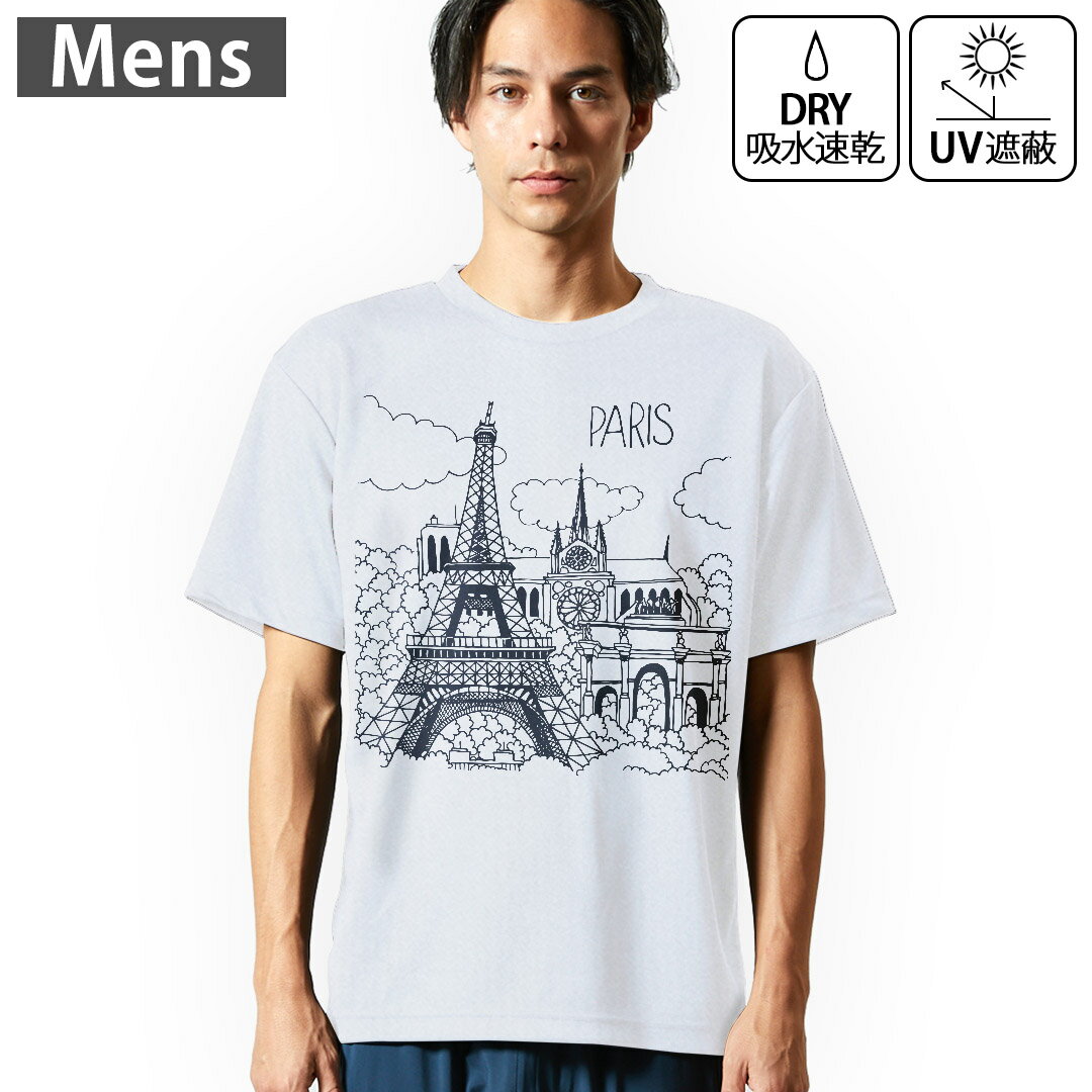 メンズ ドライTシャツ ホワイト 半袖 4.1オンス ジム トレーニング スポーツ 運動会 ドライアスレチック UVカット 紫外線遮蔽 吸水速乾 デザイン Tshirt S M L XL 2XL 3XL 4XL 5XL 6XL 014201 パリ 外国 塔