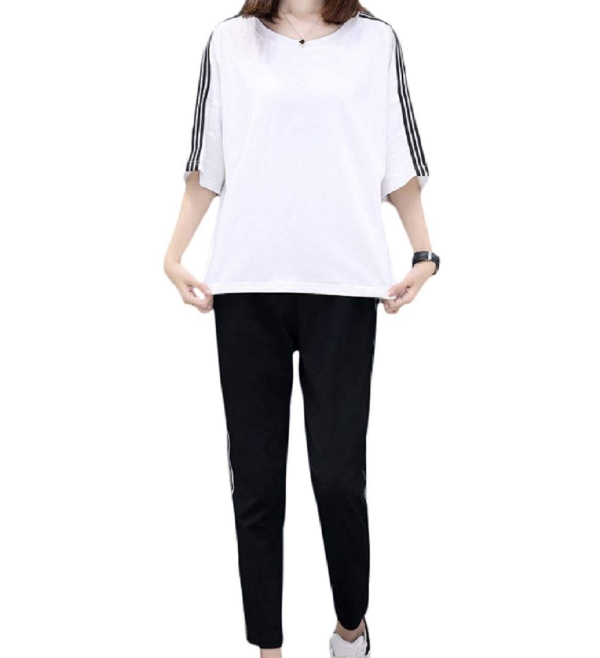 【送料無料】[ジルア] レディース スウェット 上下セット ジャージ 半袖 tシャツ 九分丈 パンツ セット ホワイト ブラック レッド #083.3 色:B083.ホワイト、サイズ:XL