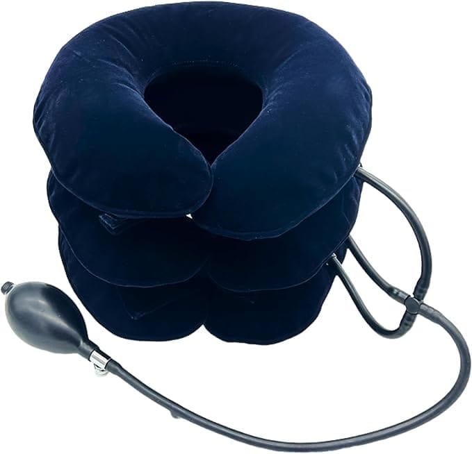 ネックストレッチャー 首サポーター 枕 コリ エアーで首伸ばし 3段・ポンプ付 首回り38cmまで スエード ネイビー 自宅 旅行 出張に 軽量 (ネイビー)
