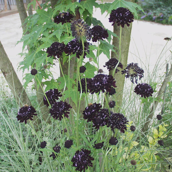 4〜6月開花 シックな黒系の花色の宿根草草花の苗/スカビオサ:エースオブスペード3-3.5号ポットシックなブラック系のスカビオサです。花径5cmほどの深みのある赤銅色の花を咲かせ、切花にもおすすめです。蕾の時はかなり黒に近い色で黒花マツムシソウとも呼ばれます。花色の濃淡は個体差があります。草丈がやや高くなりますので、ガーデニングや寄せ植えのポイントに向きます。学名:Scabiosa atropurpureaタイプ:マツムシソウ科マツムシソウ属の耐寒性宿根草開花期:4〜6月草丈:60〜90cm用途:花壇、鉢植え日照:日向むき栽培方法:日当たりと水はけの良い土を好みます。酸性土壌を嫌うので植付け前に苦土石灰を振りまき、元肥を入れてよくすき込んでおきます。乾燥に弱いので、夏前に敷き藁などで株元を覆うと良いでしょう。寒さには強いので、露地でも大丈夫です。写真は成長・開花時のイメージですが、お届けの際は苗の状態です。スカビオサ:エースオブスペード3-3.5号ポットの栽培ガイドナチュラルガーデン エフメールセレクト(fセレクト)の草花苗