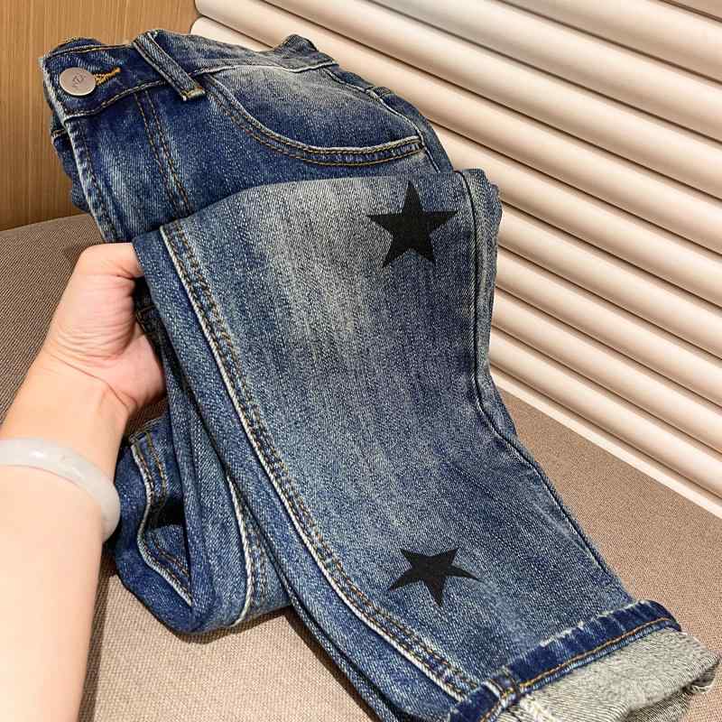 メンズ ファッション 服 男性用 オシャレ シンプル 大人 かっこいい ストリート ハイエンド ストレッチ ジーンズ 韓国スタイル 五芒星 プリント ジーンズ スリムフィット スキニー クロップドパンツ