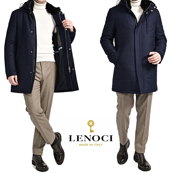 【P20倍】 レノーチ LENOCI 【2025-26年 秋冬新作】 立ち襟ファー フード付き 中綿入りスタンドカラーコート 秋冬 メンズ アウター CANONICO カノニコ 高機能ヴァージンウール 100% ネイビー イタリア ブランド MADE IN ITALY