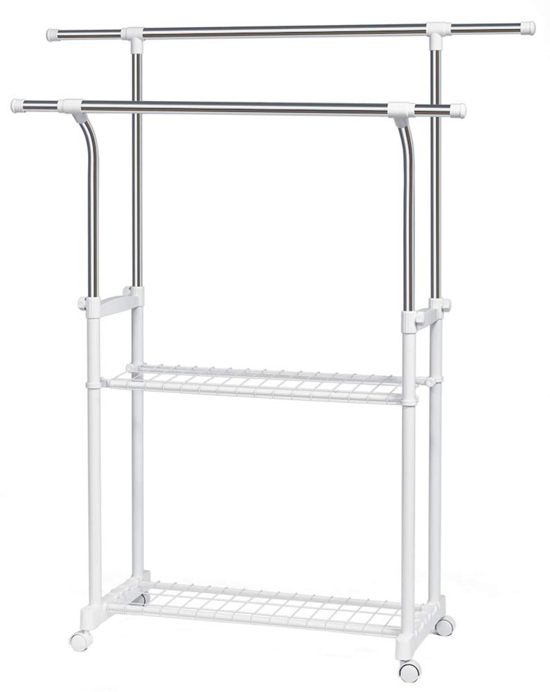 【まとめ買いで最大1000円OFFクーポン!】【送料無料】パイプハンガー ダブル カーブデザイン 大容量 収納ラック ステンレス 太パイプ 頑丈 キャスター・ネット付き 縦横伸縮タイプ 幅90~155×奥行43×高さ95~160cm 耐荷重50kg 2年品質保証 YJ-SC002