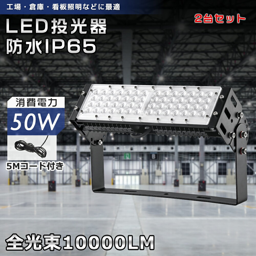 【特売2台】LED投光器 50W 10000lm 昼光色 昼白色 電球色 LED ワークライト フラッドライト 薄型投光器 高輝度 省エネ チラツキ無し 50WLED 高天井照明 屋外 防水 IP65 野外灯 街灯 工場 倉庫 ガーデン 夜間 ステー付き 180°自由調整 アース付きプラグ 生活防水 PSE 1年保証