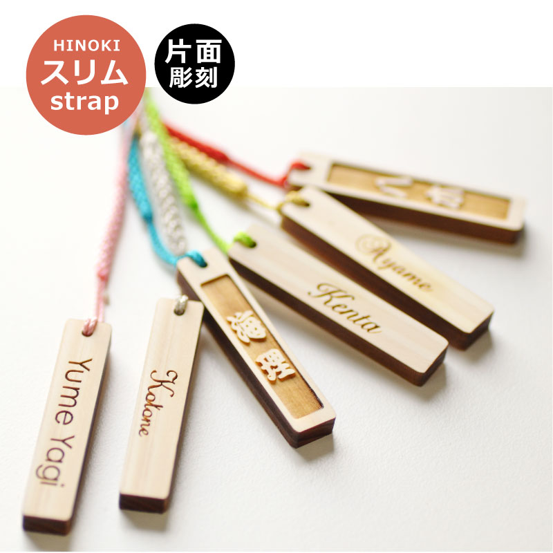 ヒノキ木札 名前入り スリム ストラップ【片面】<スマホ キーホルダー><プチギフト 名前入り>大量のご注文もOK★3,980円以上ご購入で送料無料!卒団記念 お返し名入れ キーホルダー ネームプレート ストラップ 木製 チャーム