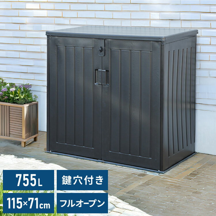 アウトドア用品から小型農機具までたっぷりしまえる屋外収納庫ブラックで汚れも目立ちにくく、景観を崩さないシンプルなデザインです。約755Lの大容量サイズ!内寸幅111.8×奥行66.5×高さ103〜107cmと大きめなので、大きな段ボールや複数個の荷物を収納できます。前面・上部扉はフルオープンタイプで、スムーズに出し入れができます。上部扉はシリンダー付きで軽い力で持ち上がります。安心の鍵穴付き!南京錠をなどでロックが可能なパーツが前面についています。頑丈な金属製で、屋外での使用も安心です。※鍵本体は別売りになります。樹脂製のため水洗いが可能です。濡れた布で拭きとるだけでも簡単にお手入れできます。アウトドア・ガーデン用品や小型農機具、タイヤなどの収納、ごみ捨て日までの一時保管場所など多用途に使用できます。■商品サイズ幅115.8×奥行71×高さ112.5cm■素材構造部材:金属(鋼)/ポリプロピレン■重量約15kg■生産国中国■備考お客様組立品※組立構造のため、大雨等の冠水による商品内への浸水は防ぐことができません。鍵本体は別売り【代引きについて】こちらの商品は、代引きでの出荷は受け付けておりません。【送料について】北海道、沖縄、離島は送料を頂きます。収納ボックス150L755L