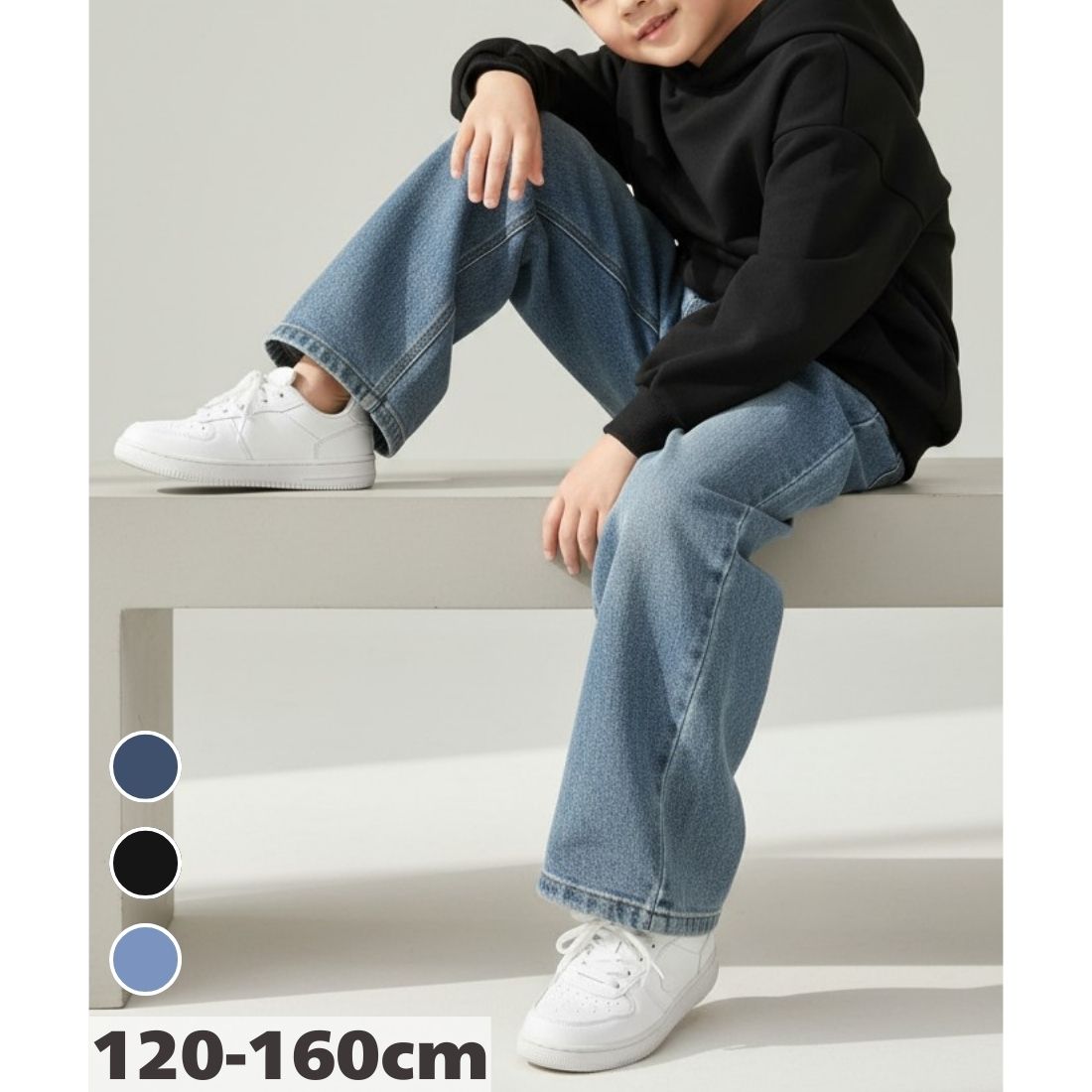 --------------------------------- デイリーに活躍する ストレート デニムパンツ --------------------------------- 丈夫な生地感と動きやすさを両立した、 通学からアクティブなシーンまで幅広く活躍するデニムパンツです。 締め付け感を抑えたストレートシルエットに、 お着替えがスムーズな総ゴム仕様のウエストを合わせた実用的なデザイン。 日常の通学はもちろん、運動会やダンスの衣装など、 活発に動くお子様の毎日をサポートする構成を目指しました。 適度な厚みのデニム生地を採用しており、 春・夏・秋・冬と季節を問わずロングシーズンで着用いただけます。 シンプルなデザインなので、パーカーやTシャツ、ジャケットなど、 お手持ちのワードローブとの組み合わせも検討しやすい一着です。 【おすすめポイント】 「自分でできる」を支える総ゴムウエスト ウエストは伸縮性の良いゴム仕様になっており、 忙しい朝の準備や、学校での着替えも一人でスムーズに行える設計です。 動きを妨げない丈夫なデニム素材 元気に動き回るお子様の日常に配慮し、耐久性のある質感に仕上げました。 ダンスや公園遊びなど、ハードな動きを伴うシーンでも軽やかに過ごしやすい仕様です。 --------------------------------- 【商品詳細】 ■カラー:ブルー/ブラック/ライトブルー ■サイズ展開:120cm・130cm・140cm・150cm・160cm ■素材:コットン ■シーズン:オールシーズン(春・夏・秋・冬) ■着用シーン例:通学・遠足・運動会・ダンス・発表会・デイリー --------------------------------- 【サイズ詳細(平置き実寸)】 ※平置きで採寸した実寸サイズです。 ※測定方法により、1〜3cm程度の差が生じる場合があります。 ■120cm:パンツ丈 71 / ウエスト 24 / 推奨身長 115-125 ■130cm:パンツ丈 75 / ウエスト 25 / 推奨身長 125-135 ■140cm:パンツ丈 78 / ウエスト 26 / 推奨身長 135-145 ■150cm:パンツ丈 86 / ウエスト 26 / 推奨身長 140-150 ■160cm:パンツ丈 92 / ウエスト 27 / 推奨身長 150-160 ※全体的にタイトなサイズ感となっております。ゆとりを持った着用をご希望の場合は、ワンサイズ大きめのご検討をおすすめしております。 ※サイズ選びに迷われた場合は、現在お持ちのお洋服と比較してご確認ください。 ※注意事項※ 海外製品のため、縫製の個体差や軽微な糸のほつれが見られる場合があります。 生産時期により、生地のカラーや一部仕様(前ポケットの有無等)が異なる場合がございますが、あらかじめご了承の上ご検討ください。 検品は国内で行っておりますが、海外製品の特性をご理解の上、ご購入をお願いいたします。