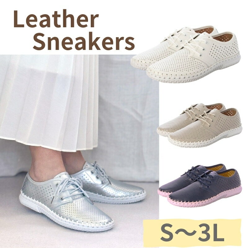 《10%OFF★BLACKFRIDAY》シューズ 本革 レディース スニーカー 疲れにくい 本革靴 スリッポン 革 パンチング 滑りにくい ゴム底 靴本革 白底 紐 通気性 カジュアル 軽量 歩きやすい 履きやすい 通勤 軽量 クッション 柔らかい ホワイト シルバー S/M/L/LL/3L