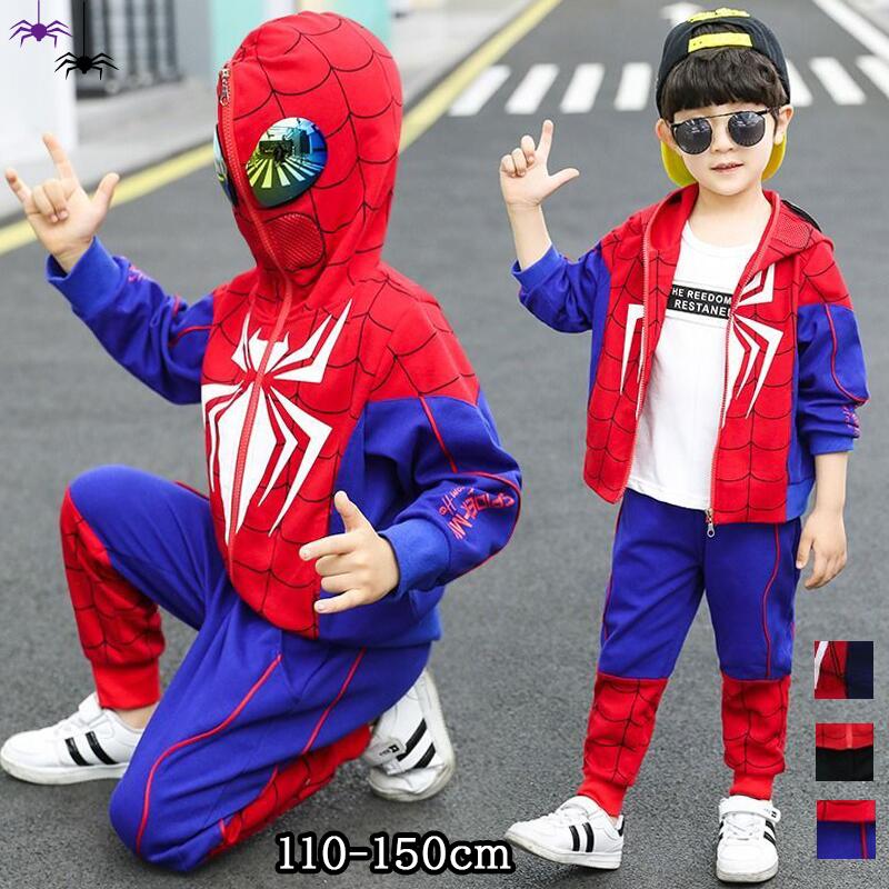 新登場 ハロウィンキッズセット 男の子 子供用 スパイダープリント 着脱式レンズ Halloween変装 コスプレ 上下セット 仮装 キッズ 子供用 文化祭 学園祭 110-150cm ネイビー ブラック レッド