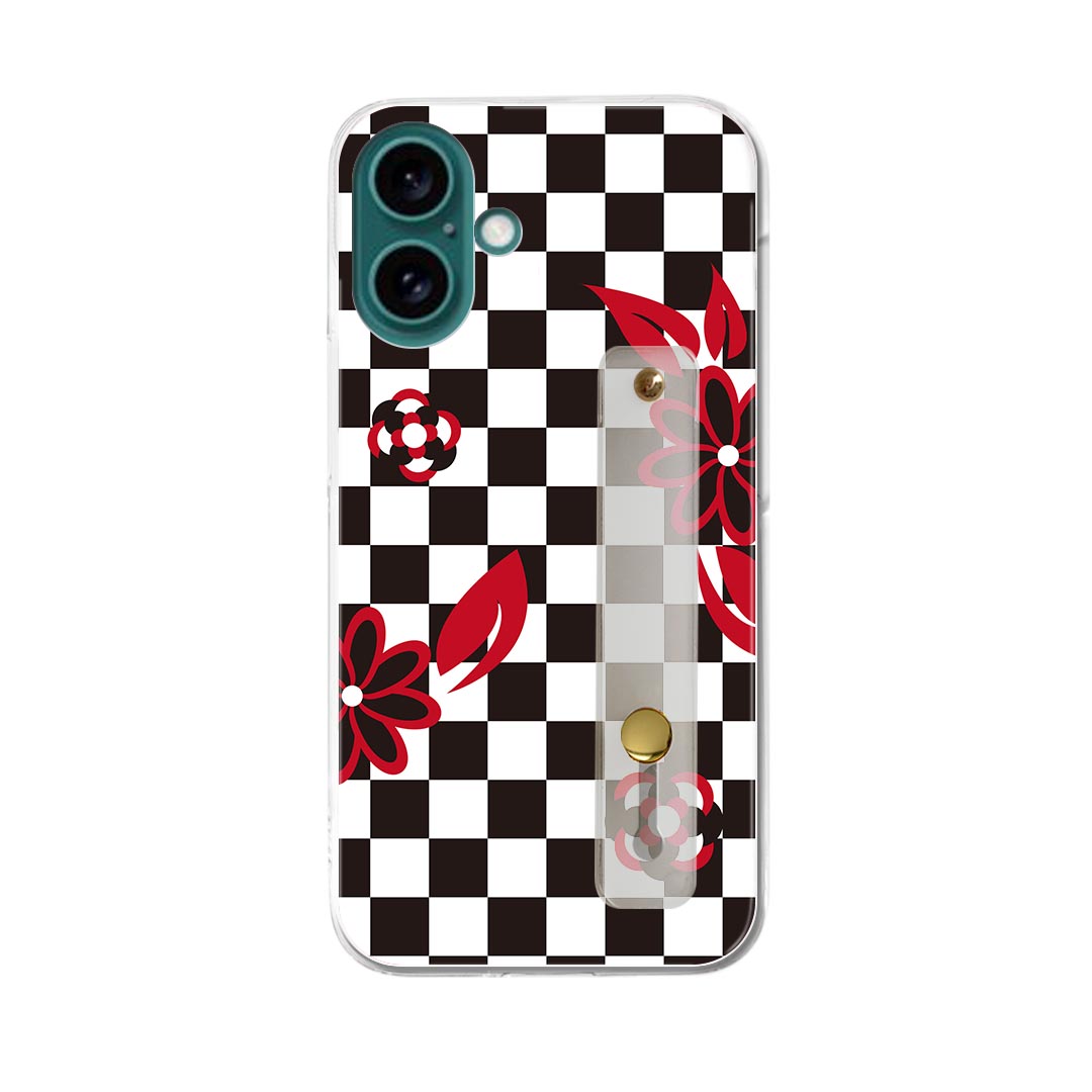 【送料無料】iPhone 16 用 ハードケース スマホ ベルト付 スマホバンド 落下防止 シリコン スタンド機能付 スリム 背面 片手持ち カバー 携帯リング フィンガーリング 角度調整 008442 花 赤 レッド 市松模様