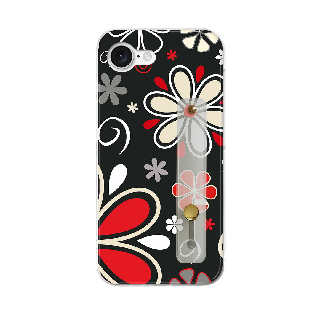 【送料無料】iPhone 16e 用 各キャリア 共通対応 iphone16e ハードケース スマホ ベルト付 スマホバンド 落下防止 シリコン スタンド機能付 スリム 背面 片手持ち カバー 携帯リング フィンガーリング 角度調整 008442 花 赤 レッド 市松模様