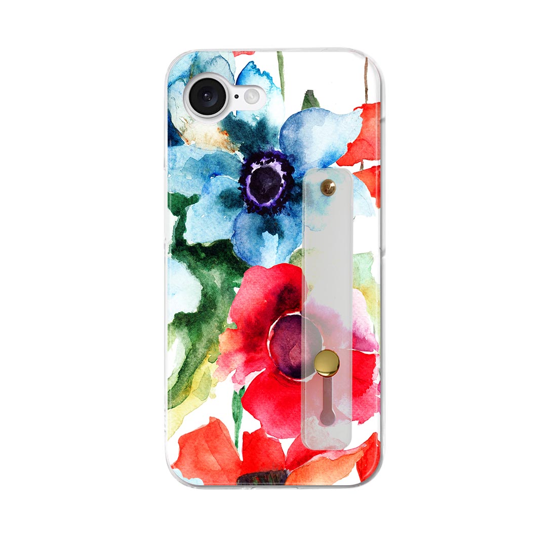 【送料無料】iPhone 16 用 ハードケース スマホ ベルト付 スマホバンド 落下防止 シリコン スタンド機能付 スリム 背面 片手持ち カバー 携帯リング フィンガーリング 角度調整 008095 花 水彩 赤 ブルー レッド