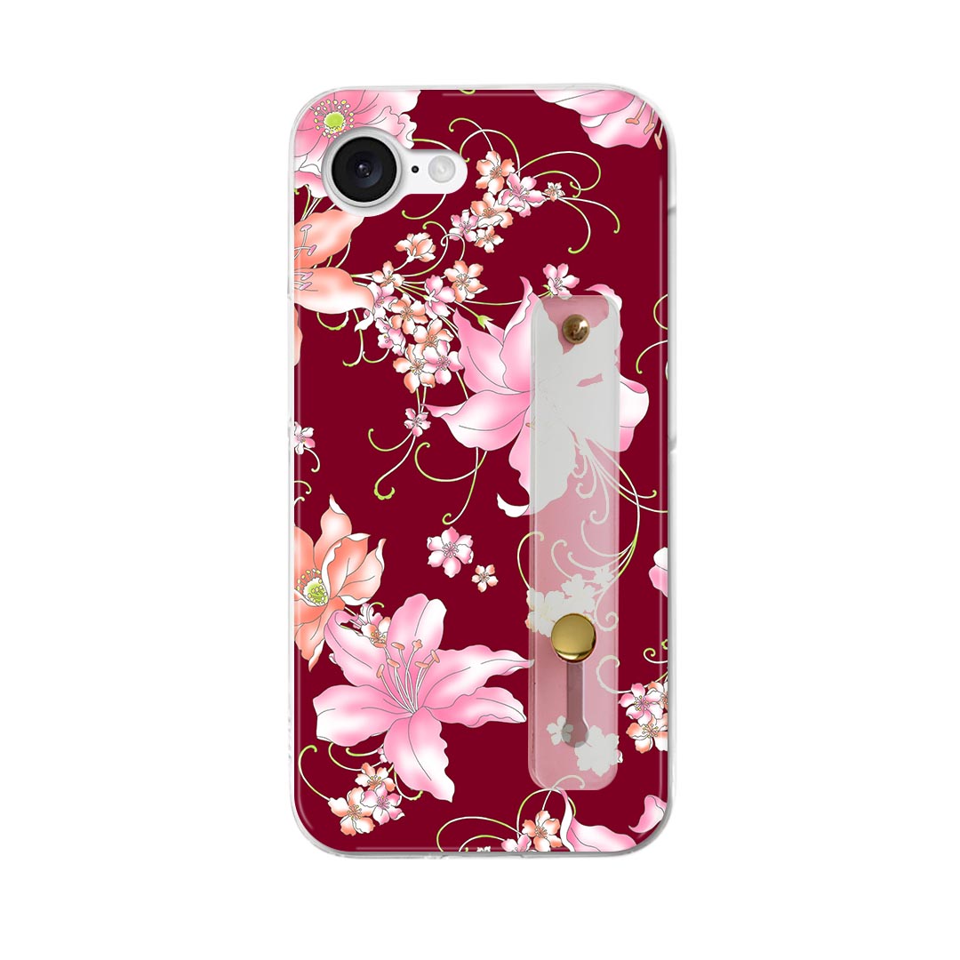 【送料無料】iPhone 16 用 ハードケース スマホ ベルト付 スマホバンド 落下防止 シリコン スタンド機能付 スリム 背面 片手持ち カバー 携帯リング フィンガーリング 角度調整 007935 和風 和柄 花 赤 レッド